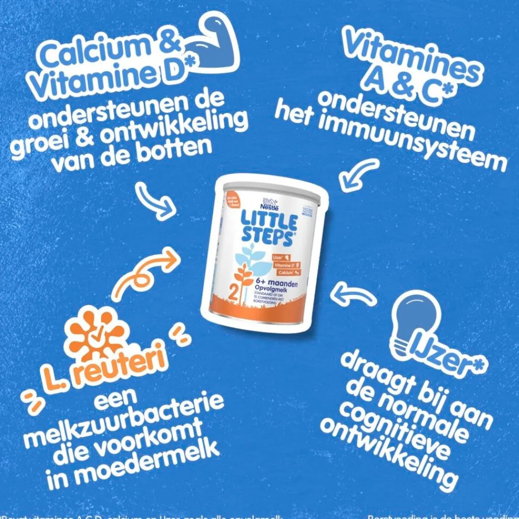 Vanaf 6 maanden kun je Little Steps 2 geven als onderdeel van een gevarieerde voeding (naast granen, groenten en fruit). Little Steps opvolgmelk bevat vitamine A, C, D, calcium en ijzer. De opvolgmelk bevat ook een toevoeging van het gepatenteerde l-reuteri.