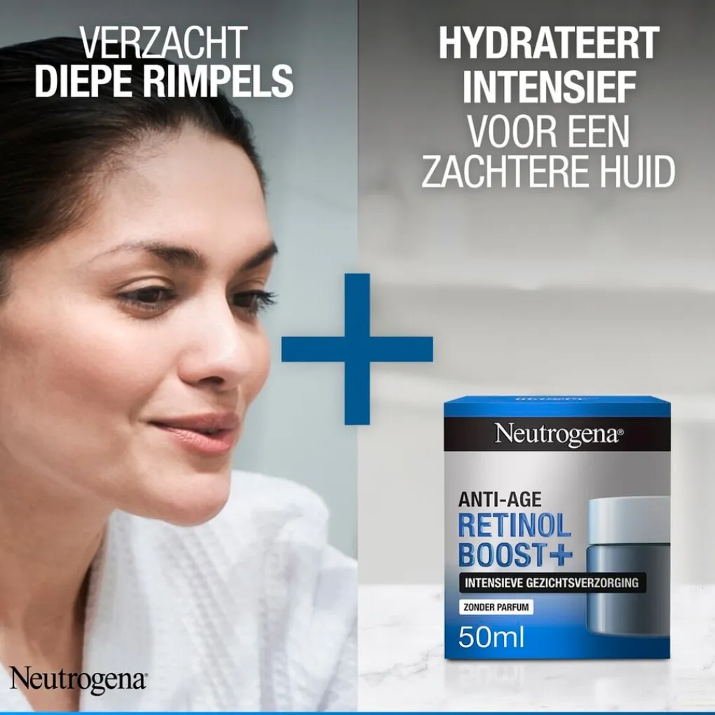 Neutrogena Anti-age Retinol Boost+ Intensieve Gezichtsverzorging is een speciale anti-aging dagcrème. Hij bestrijdt zichtbare tekenen van huidveroudering: rimpels, verminderde strakheid, vermoeide huid, droogheid en pigmentvlekken.