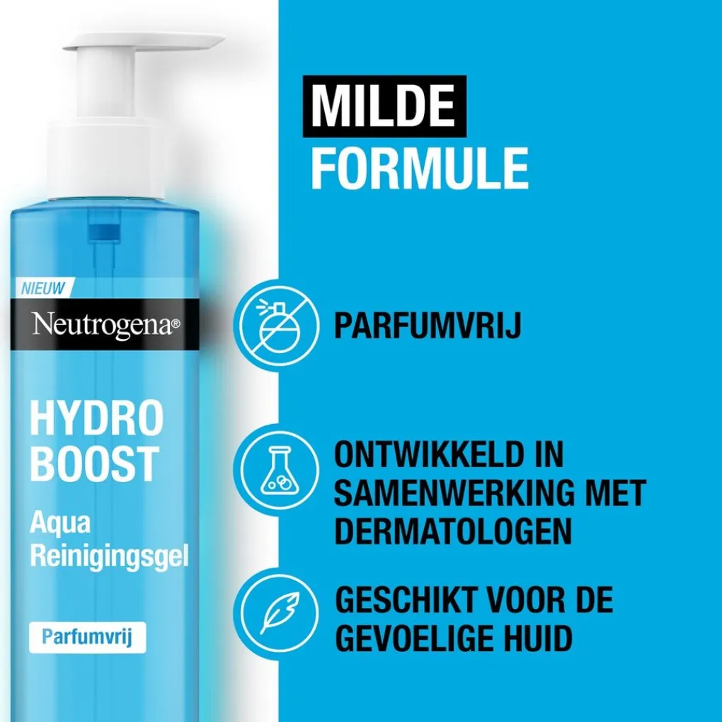 Ontdek de parfumvrije Neutrogena Hydro Boost Aqua Reinigingsgel. Deze geavanceerde formule, ontwikkeld in samenwerking met dermatologen, is doordrenkt met hydraterende ingrediënten zoals hyaluronzuur en glycerine.