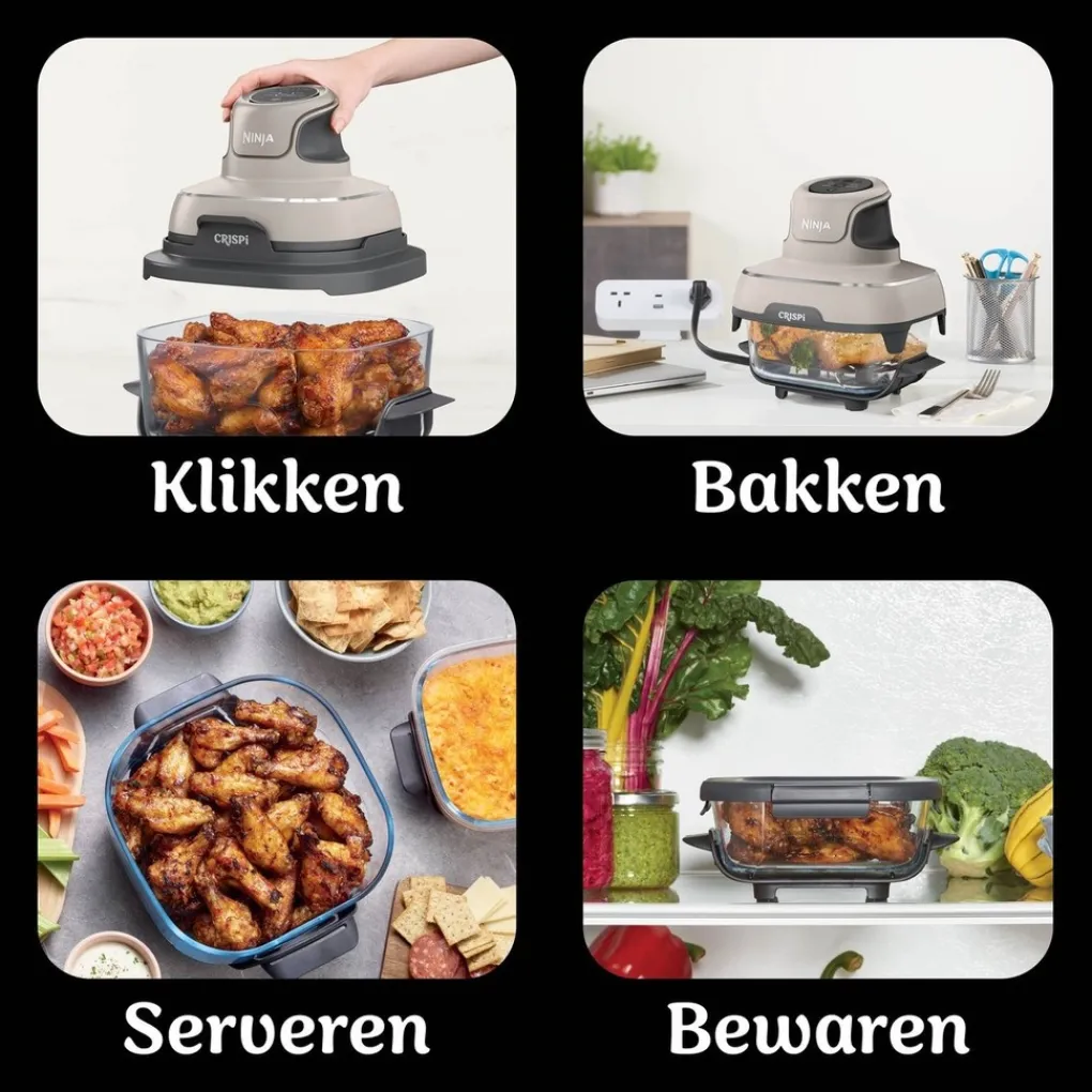 Maak kennis met de Ninja CRISPi 4-in-1 compacte, glazen airfryer voorzien van vier functies; Airfryen, Braden, Warmhouden en Opnieuw krokant maken. Klik de lichte 1700 watt PowerPod op de glazen schaal, selecteer je functie, druk op start en je hebt binnen no-time een perfect gegaard gerecht op tafel. Voor kleine en grotere hoeveelheden. Bovendien gebruikt de Ninja CRISPi tot wel 50% minder energie dan een heteluchtoven.*