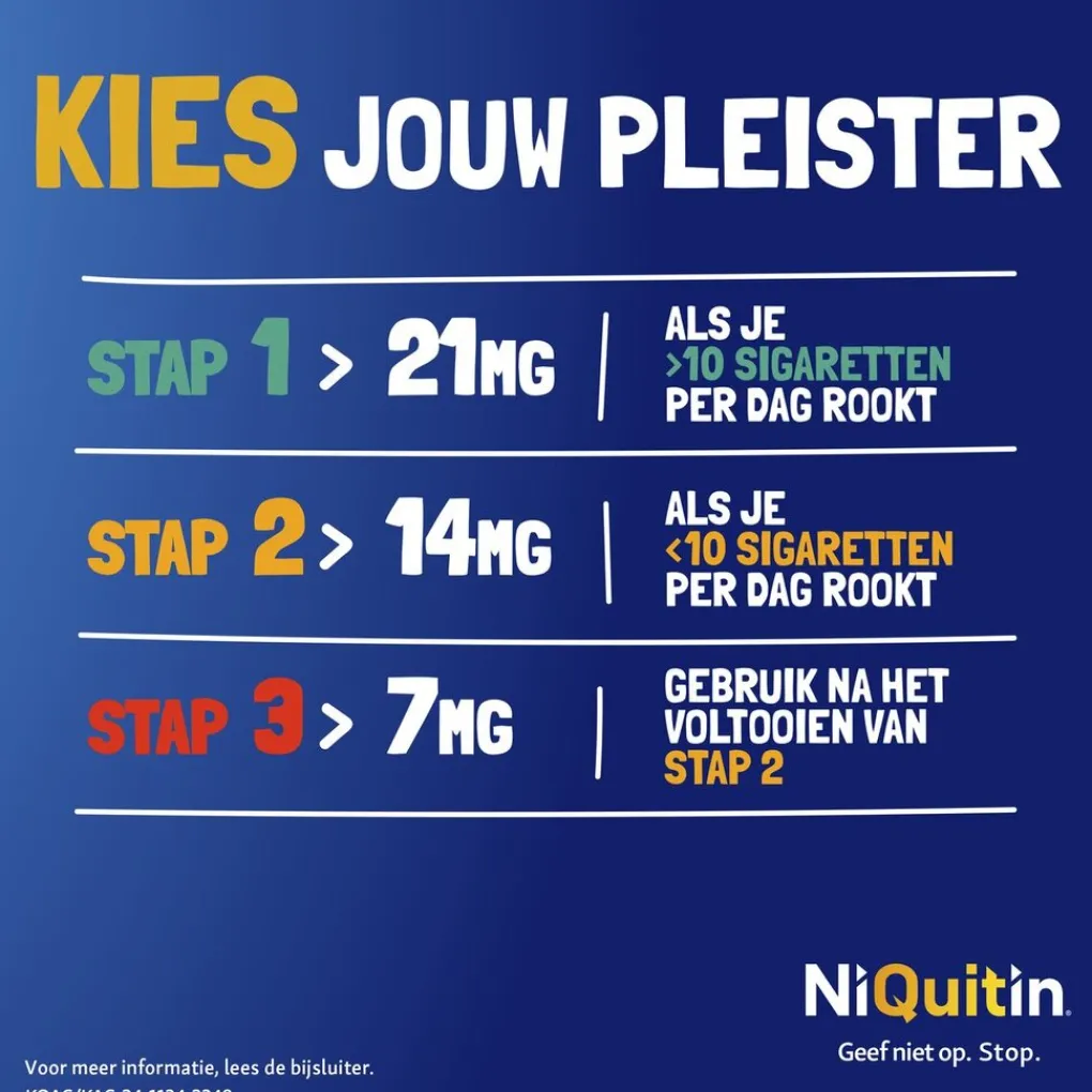 Stap 3: NiQuitin Transparante Pleister 7 mg: gedurende laatste 2 weken iedere dag 1 pleister.