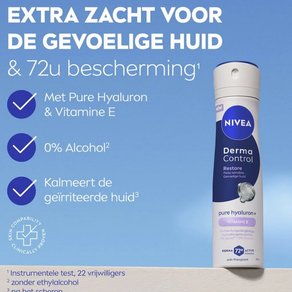 De NIVEA Derma Control Restore Antitranspirant Spray is anti-bacterieel** en anti-irritatie. De anti-transpirant is vrij van ethylalcohol. De huidverdraagzaamheid is dermatologisch getest op de gevoelige huid.