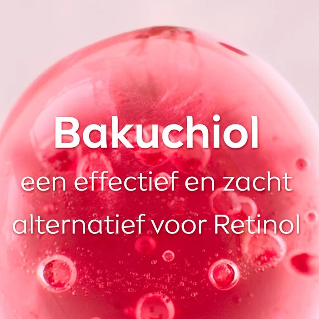 Het serum bevat bakuchiol, een natuurlijke antioxidant die effectief huidveroudering tegengaat. Het stimuleert celvernieuwing en collageenaanmaak, waardoor je huid steviger wordt met een liftend effect.