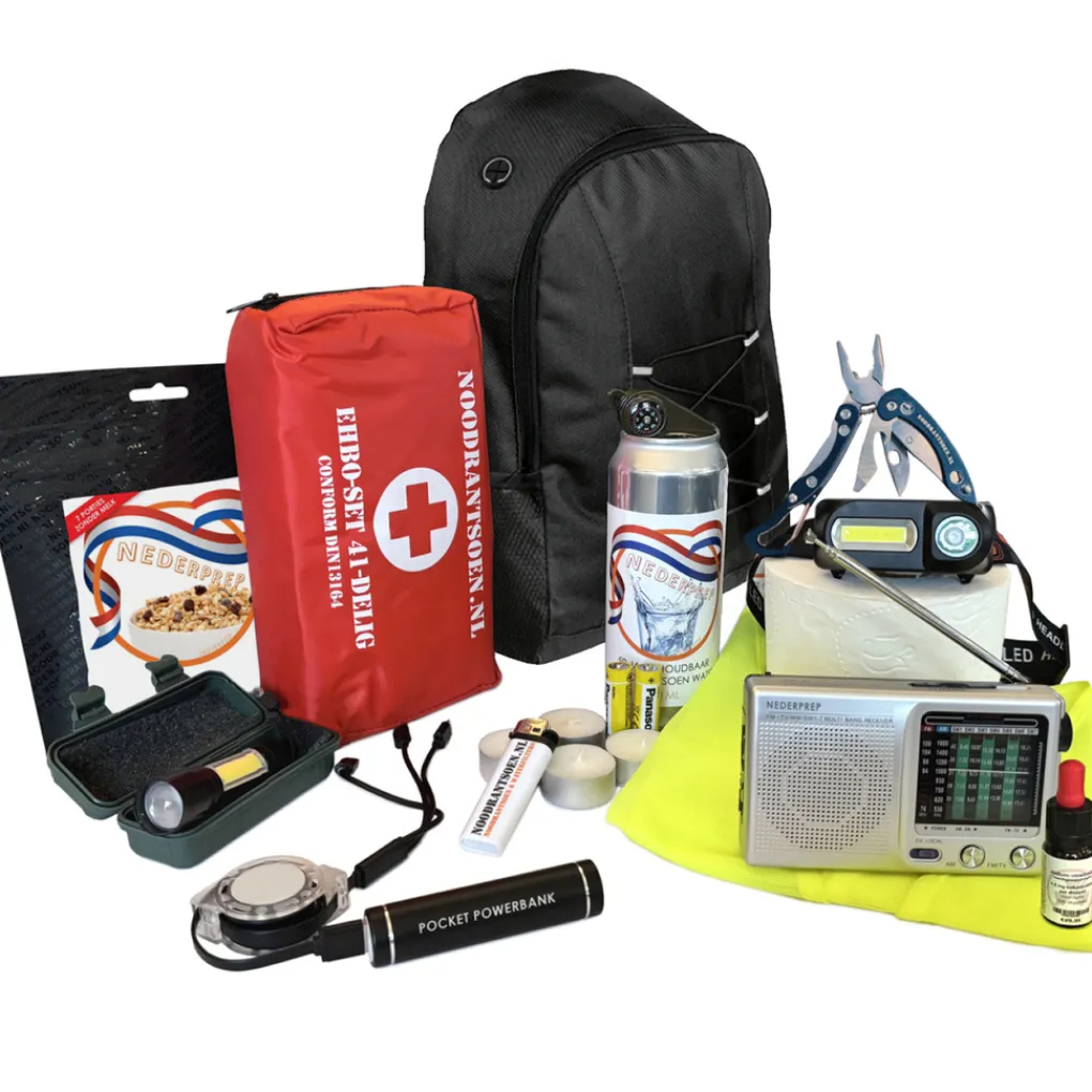 De overheid adviseert voor dit soort rampen en calamiteiten een noodpakket in elk huis en voertuig te hebben. Daarmee kun je de eerste 24 uur overleven zonder hulp van buitenaf. In een noodpakket zit onder andere een radio om naar de rampenzender te luisteren, een zaklamp en een EHBO-kit, een powerbank om je telefoon op te kunnen laden. Voor 1 dag aan 25 jaar houdbaar eten en drinken (noodrantsoen) en natuurlijk een hoog gedoseerd Jodium-supplement welke je nodig kan zijn in geval van blootstelling aan radioactief jodium na een (kernramp/kernexplosie).