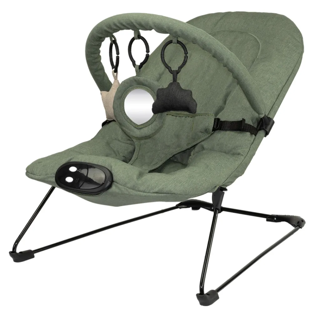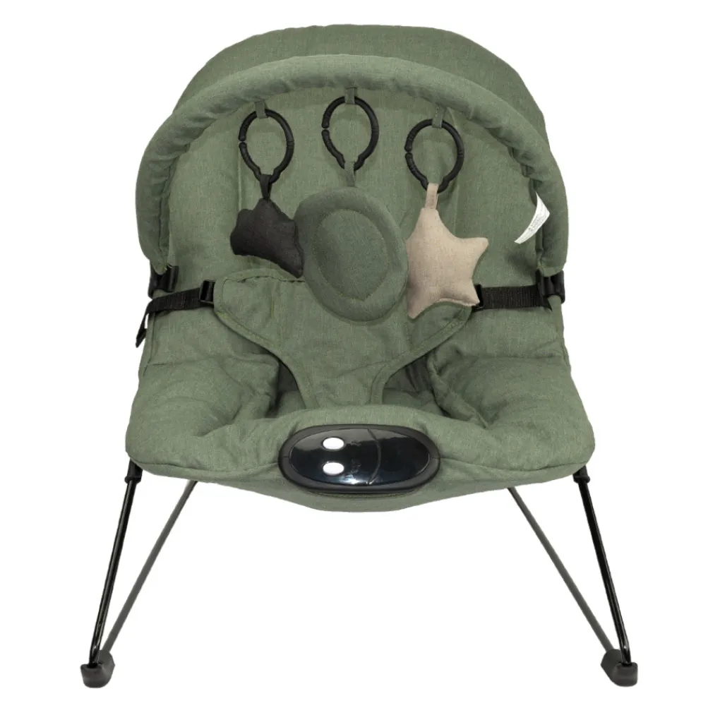 De wipstoel heeft een leuke speelboog met 3 speeltjes. De speeltjes bestaan uit 2 (knijp)speeltjes die geluid maken en 1 spiegeltje. De speelboog is afneembaar maar ook weer eenvoudig vast te klikken. Jouw kindje wordt veilig in de bouncer bevestigd door middel van een 3 -puntsgordel. Is de bekleding vies? Geen probleem, deze is afneembaar en wasbaar in de wasmachine.