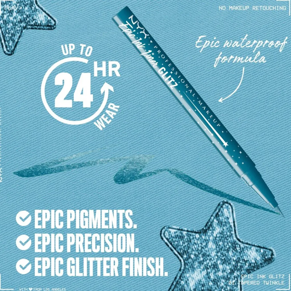Ontdek de intense, metallic kleuren en ultieme precisie van de NYX Professional Makeup Epic Ink Liner Glitz Tapered Twinkle 01 Eyeliner.