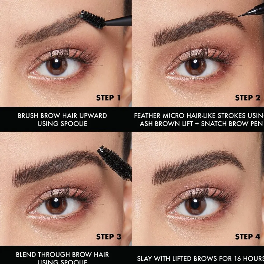 Voor een strakke ‘gelamineerde’ look borstel je de haartjes eerst omhoog met een wenkbrauwsetten en vul je daarna je wenkbrauwen in met de Lift & Snatch.