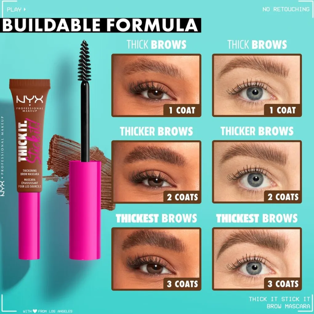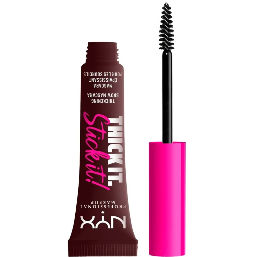 Stick it to ‘em met de vegan NYX Professional Makeup Thick It. Stick It! Espresso Brow Mascara. De wenkbrauwmascara met getinte en haarachtige vezels van plantaardige oorsprong geeft tot 16 uur lang resultaat.