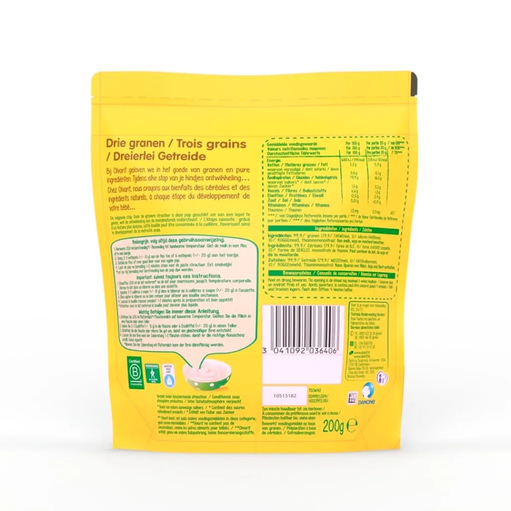 Een voedzaam ontbijt voor je kleintje is belangrijk. Olvarit 6-8M Drie Granen Pap bevat geen toegevoegde suikers* en is rijk aan vezels, speciaal afgestemd op de voedingsbehoefte van je kindje. Een ideaal begin van de dag!