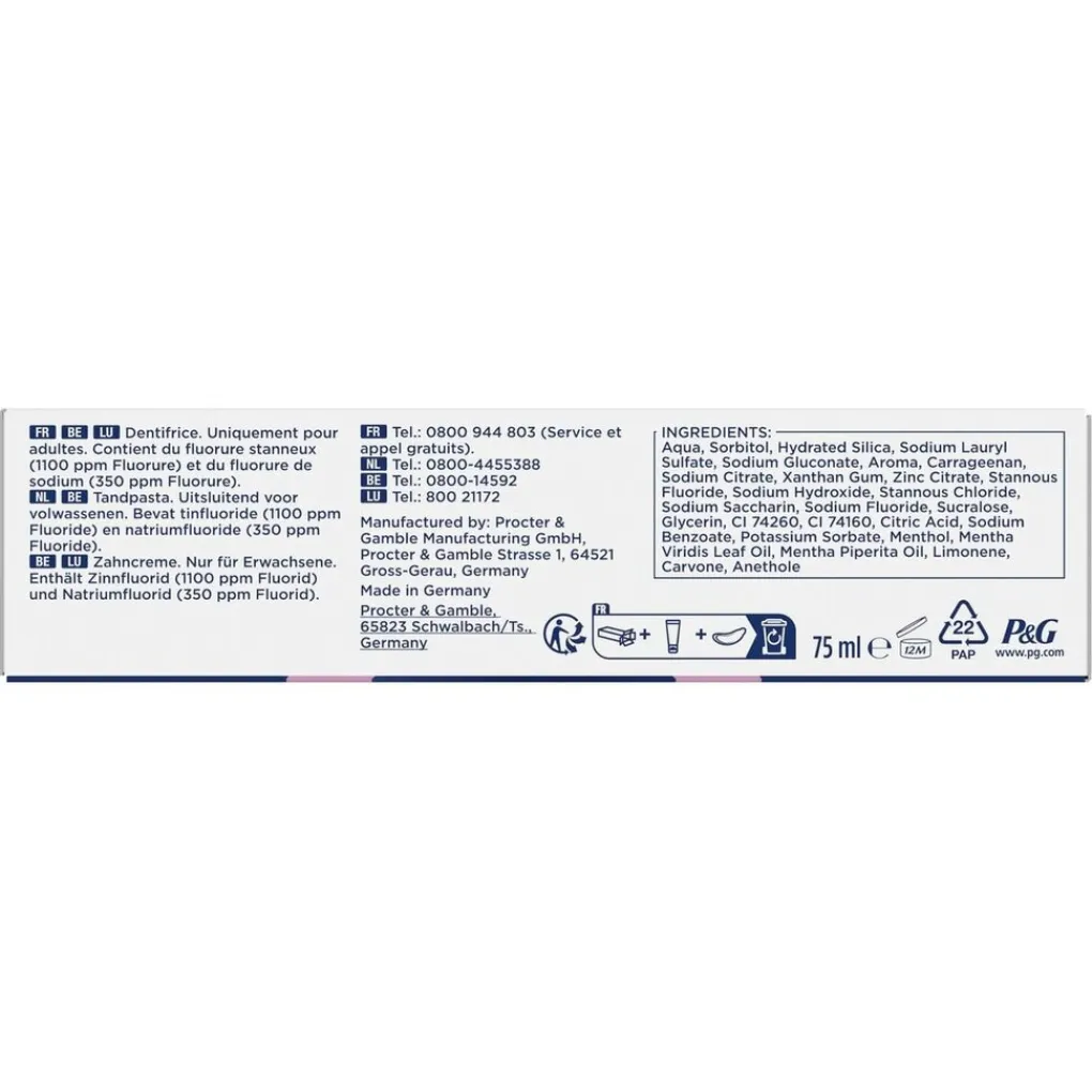 INGREDIENTS: Aqua, Sorbitol, Hydrated Silica, Sodium Lauryl Sulfate, Sodium Gluconate, Aroma, Carrageenan, Sodium Citrate, Xanthan Gum, Zinc Citrate, Stannous Fluoride, Sodium Hydroxide, Stannous Chloride, Sodium Saccharin, Sodium Fluoride, Sucralose, Glycerin, CI 74260, CI 74160, Citric Acid, Sodium Benzoate, Potassium Sorbate, Menthol, Mentha Viridis Leaf Oil, Mentha Piperita Oil, Limonene, Carvone, Anethole. Bevat tinfluoride (1100 ppm Fluoride) en natriumfluoride (350 ppm Fluoride).