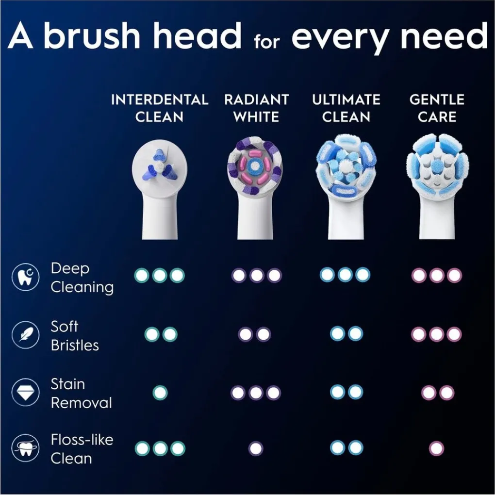 • Gespreide borstelharen: de Oral-B vervangende opzetborstels hebben gespreide borstelharen die aangeven wanneer je de opzetborstel moet vervangen voor een optimale reiniging