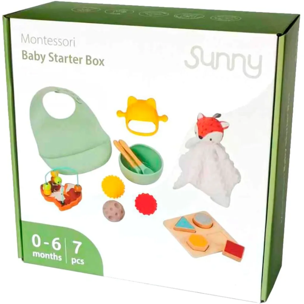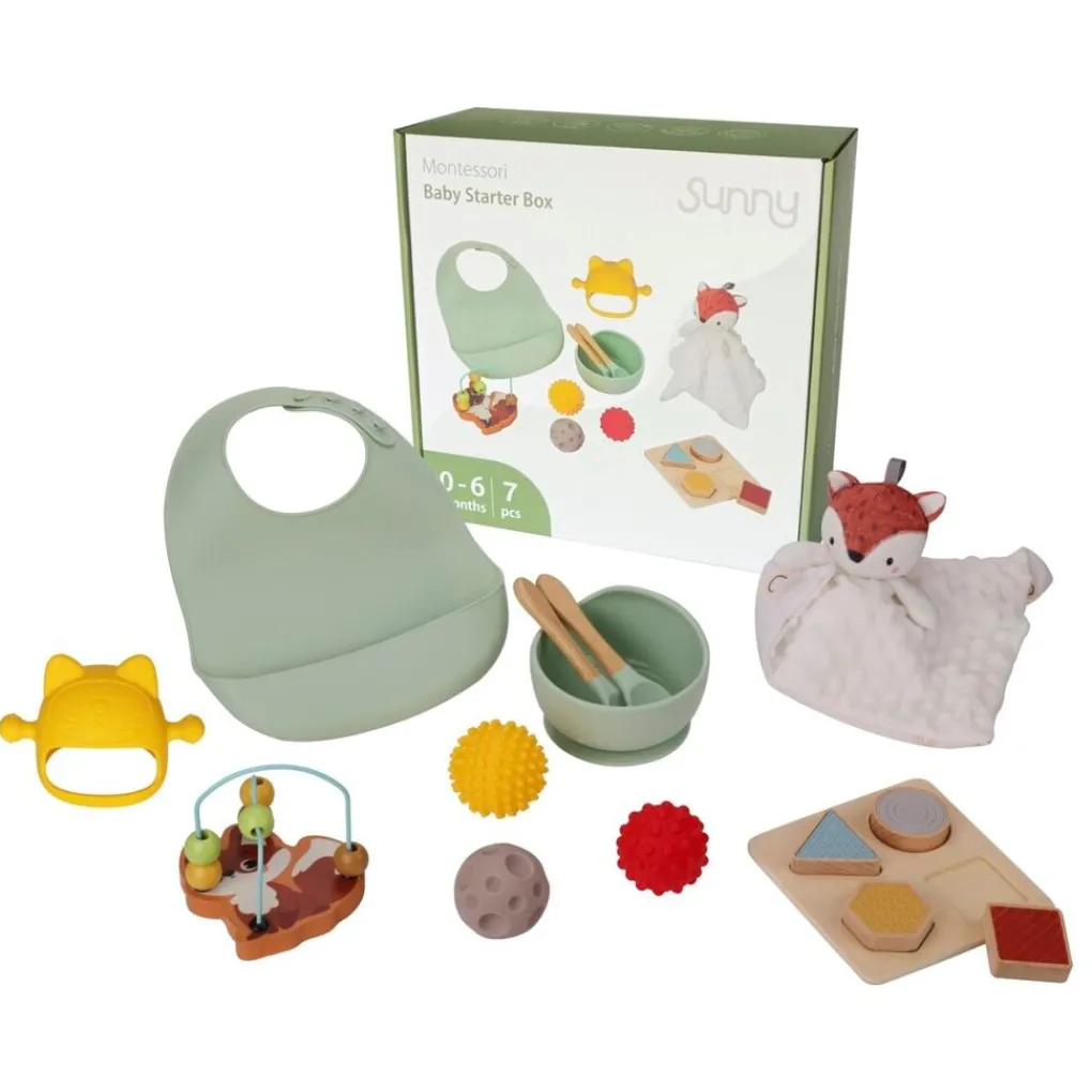 In deze startersset zit alles om je kleintje een goede start te geven. In de Sunny Montessori Baby Starter Box zit onder andere een slabbetje, een knuffeltje, speelgoed en meer. De zevendelige set is geschikt voor baby’s van 0 tot 6 maanden.