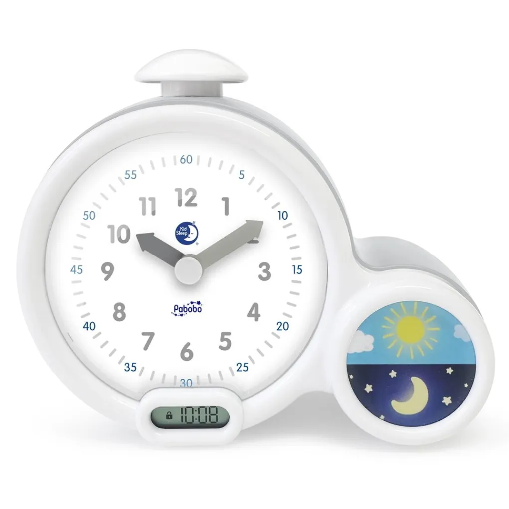 De klok heeft een analoge klok (met wijzers) en een digitale klok, zodat je kindje op alle manieren de tijd leert lezen. Deze slaaptrainer is ook als wekker te gebruiken; je kunt daarbij kiezen uit 3 weksignalen: trein, koekoek of vogelgezang. De wekker is voorzien van een knop om te ‘snoozen’ en de klok te verlichten.