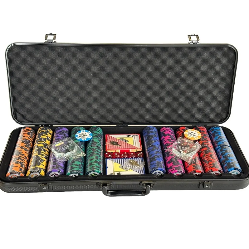 Deze Deluxe poker set bestaat uit 6 sets van 50 chips en 2 sets van 100 chips. 2 decks professionele plastic poker kaarten, een dealer butten, small blind, big blind en 5 dobbelstenen.