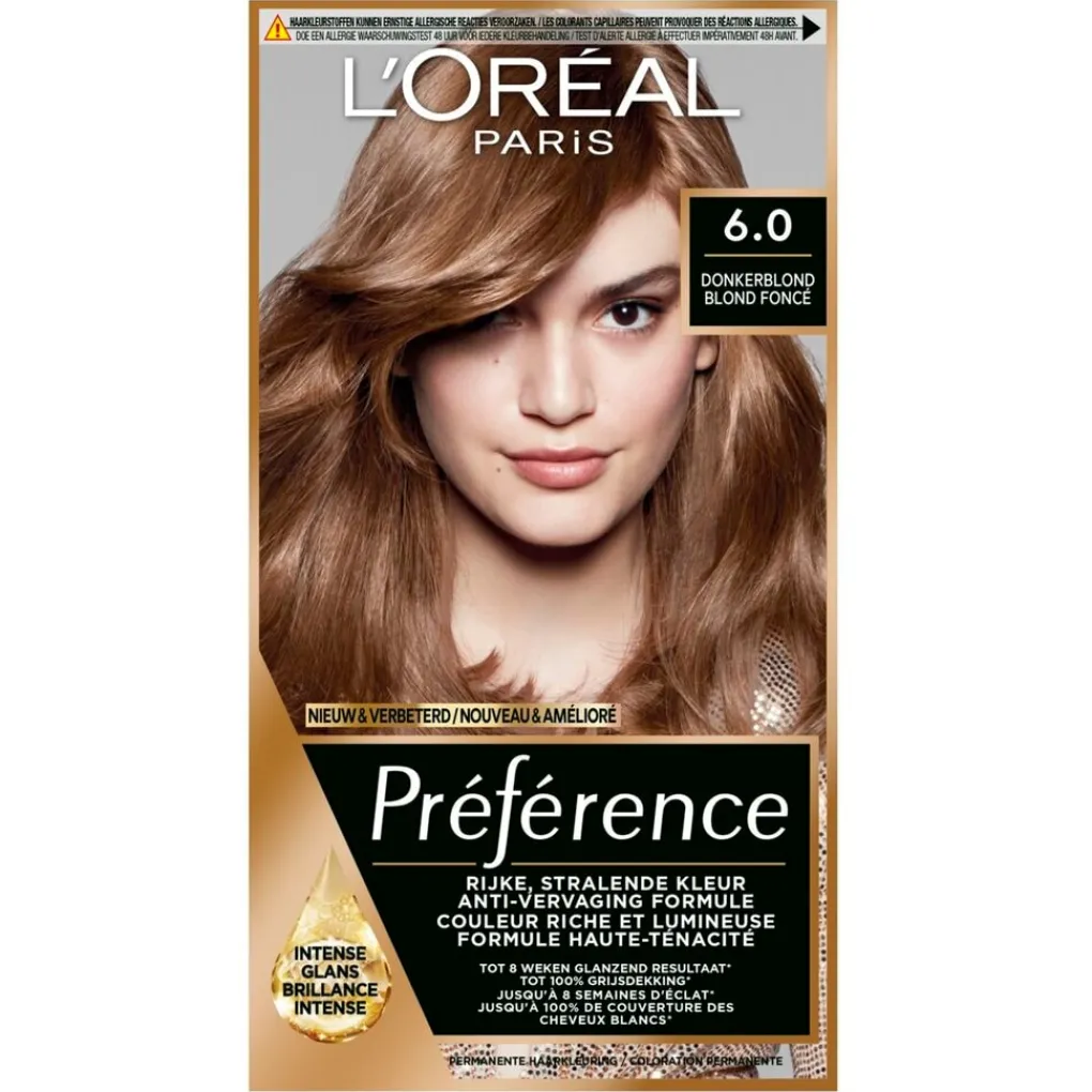 Ga voor een natuurlijk ogende, glanzende en stralende kleur vol reflecties met L’Oréal Paris Préférence 6 Donkerblond Permanente Haarkleuring. De haarverf biedt tot 100% grijsdekking en zorgt voor een langdurige glans.
