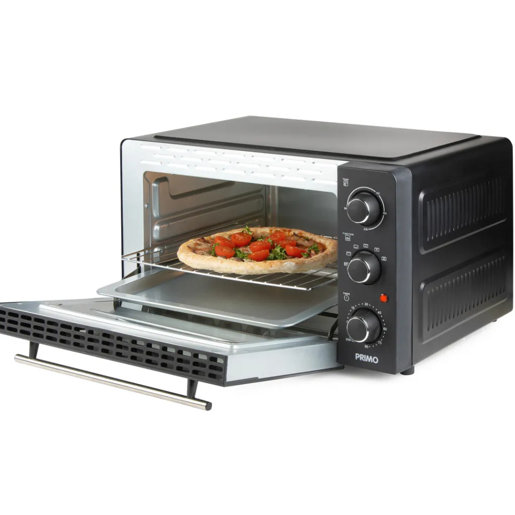 De PRIMO PR254OV is een vrijstaande oven met een inhoud van 28 liter. De mini oven kan worden ingesteld op 4 verschillende ovenstanden: hetelucht, bovenwarmte, onderwarmte en boven- en onderwarmte. De verschillende ovenstanden en temperatuur zijn met behulp van de draaiknoppen makkelijk in te stellen tot maximum 230°C. Dankzij de timer kan je de baktijd perfect bepalen en de binnenverlichting zorgt er voor dat je het bakproces makkelijk kan volgen. Bij deze oven worden een bakplaat, ovenrooster en kruimelopvangschaal meegeleverd die het toestel compleet maken.