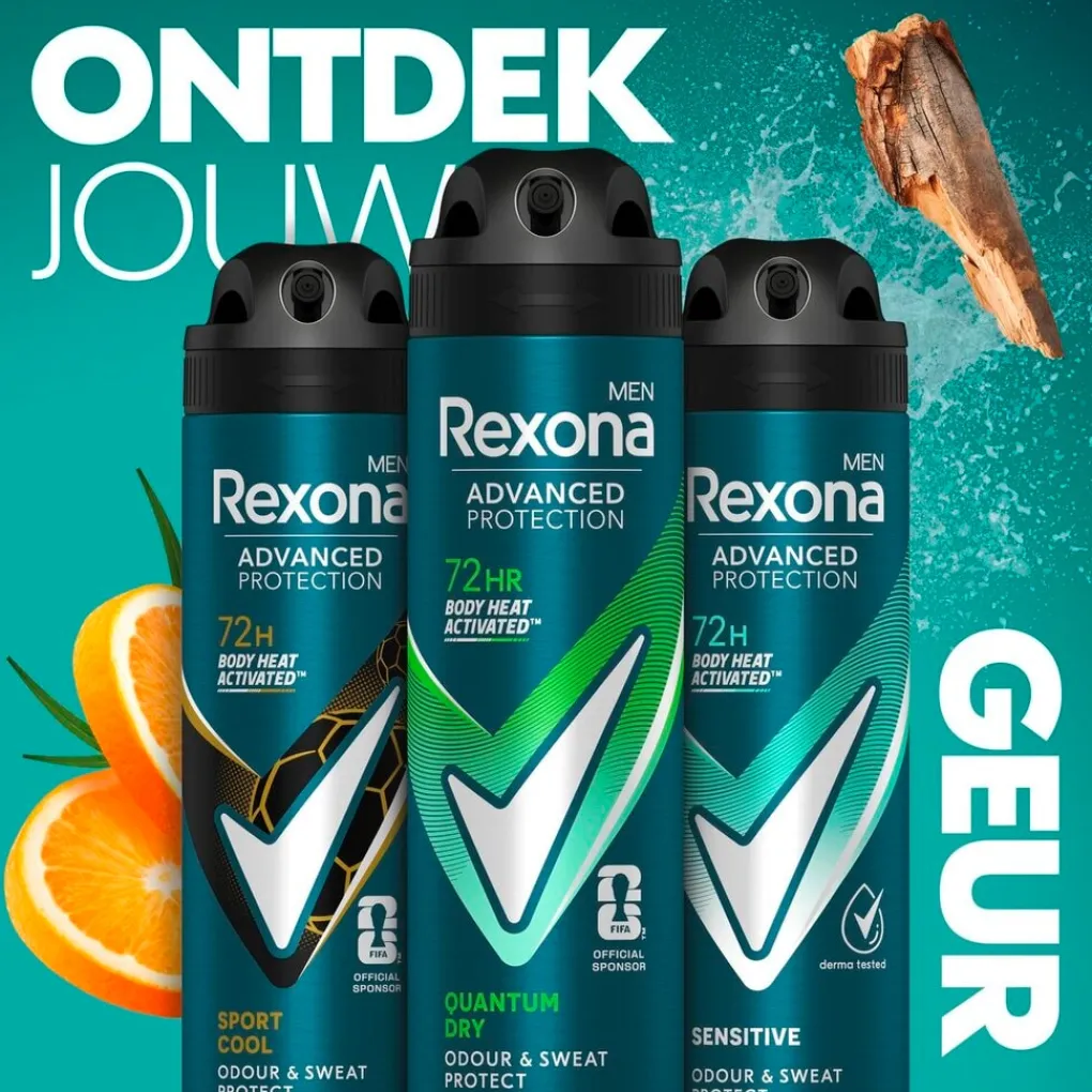 De Rexona Men Advanced Protection Quantum Dry Antitranspirant Deodorant Spray biedt tot 72 uur bescherming tegen zweet en ongewenste lichaamsgeur.