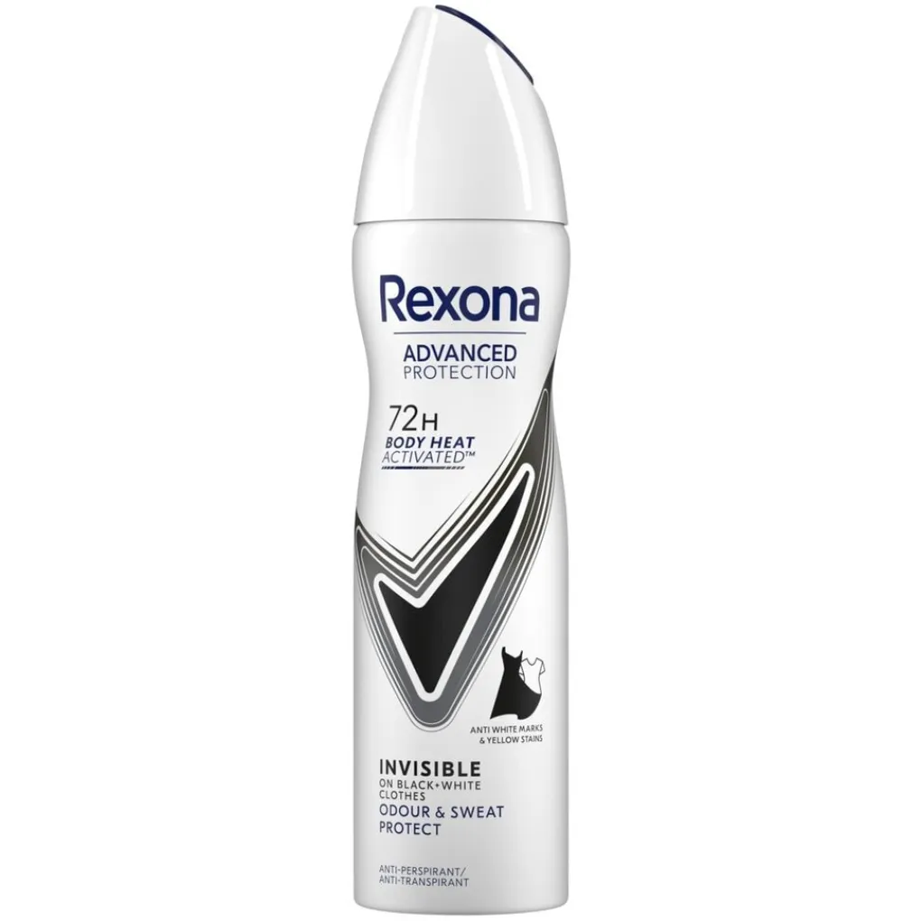 Rexona Women Advanced Protection Invisible Antitranspirant Spray met Body Heat Activated technologie beschermt tot 72 uur tegen zweet, lichaamsgeur en vlekken.
