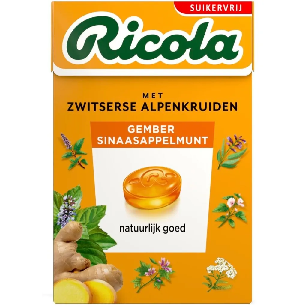 De suikervrije Ricola Gember Sinaasappelmunt Kruidenpastilles zijn een combinatie van dertien kruiden uit de Zwitserse Alpen met intens kruidige gember en friszoete sinaasappelmunt.