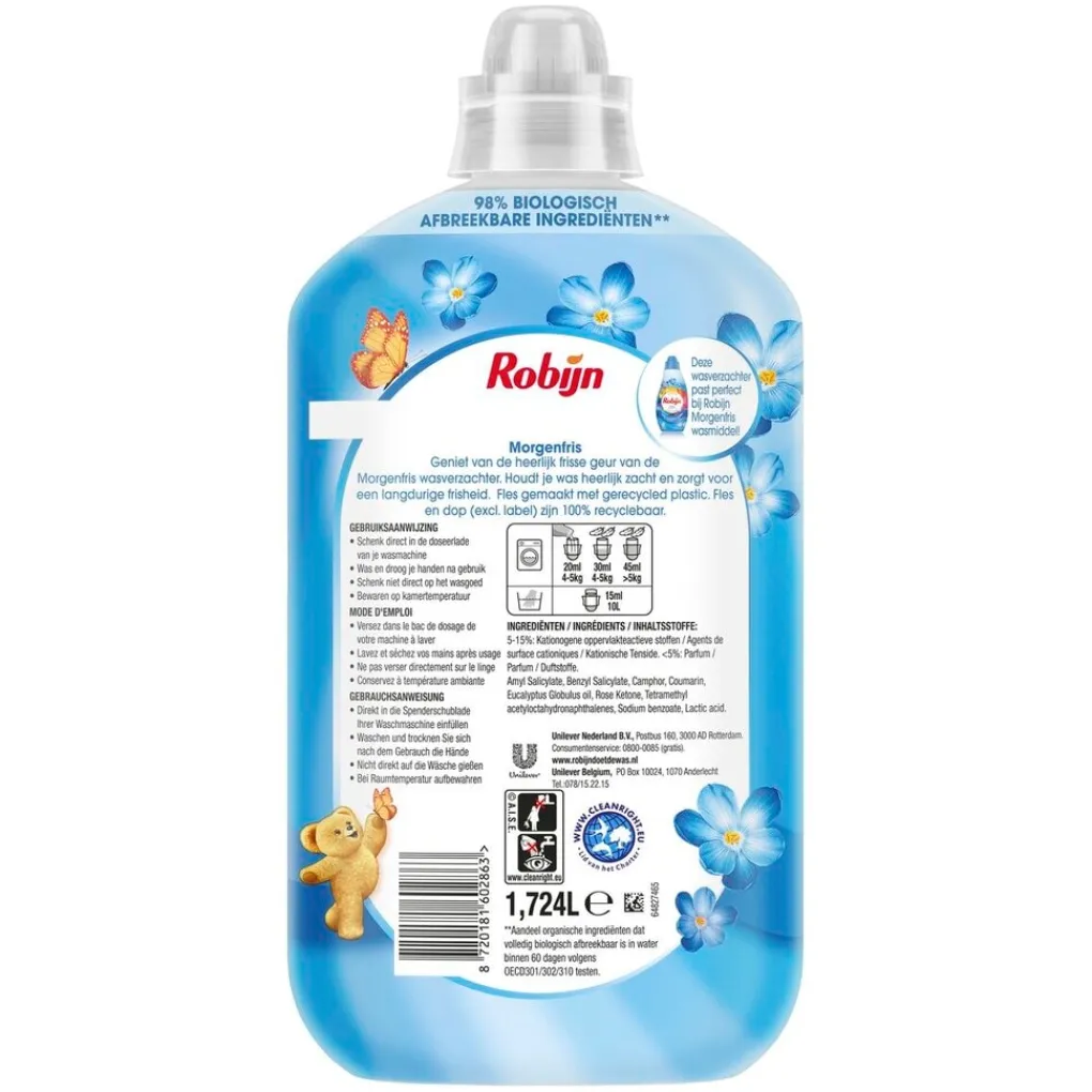 De Robijn Classics Morgenfris Wasverzachter heeft een frisse geur, beschermt je kleding tegen slijtage en maakt het heerlijk zacht! De wasverzachter is voor 95% biologisch afbreekbaar.