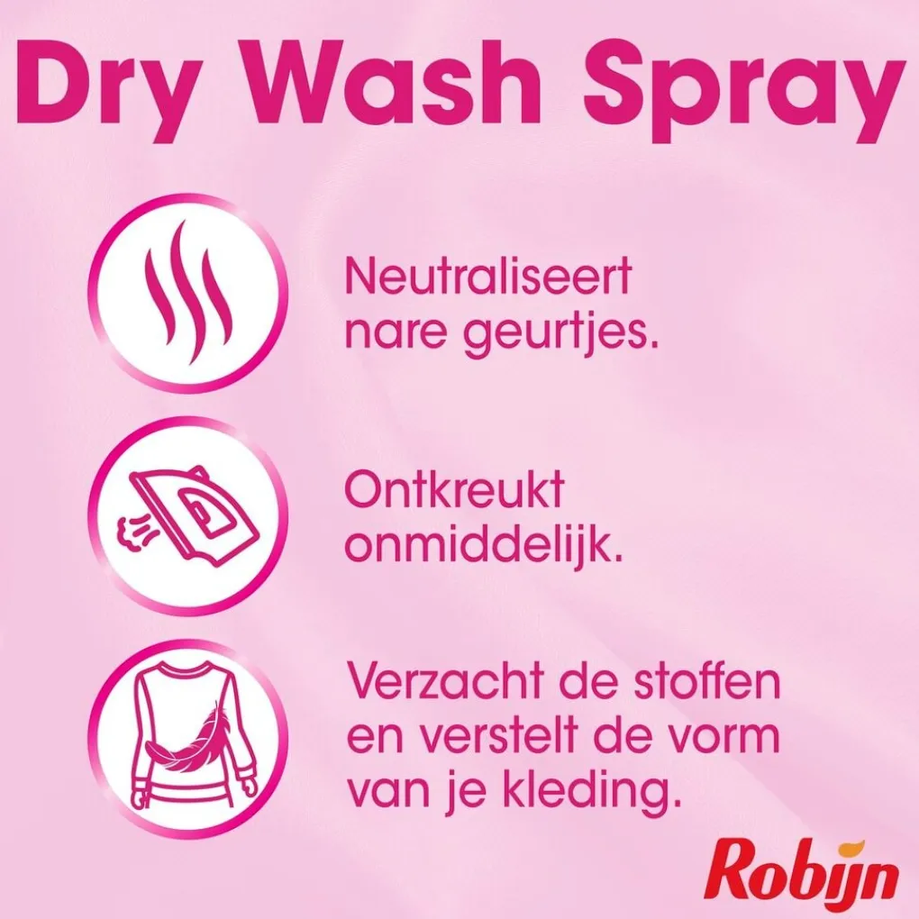 Met Robijn Pink Sensation Dry Wash Spray verfris je je kleding tussen de wasbeurten in. De spray neutraliseert nare geurtjes, ontkreukt onmiddellijk, verzacht de stof en herstelt de vorm.