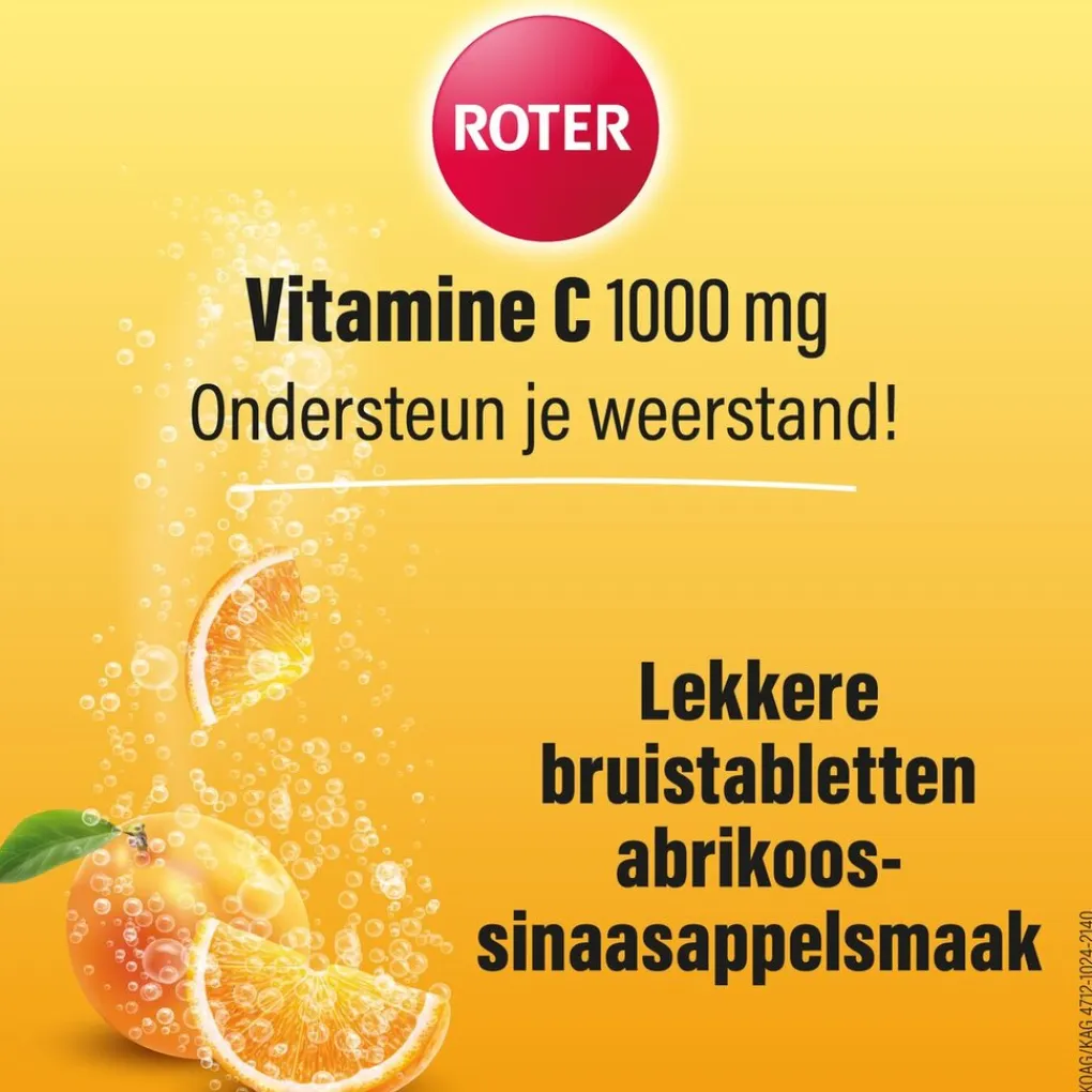 Roter Vitamine C 1000 mg Abrikoos-Sinaasappel Bruistabletten ondersteunen je natuurlijke weerstand met een hoge dosis vitamine C. De bruistabletten lossen makkelijk op in water en zijn dus handig bij moeite met slikken.