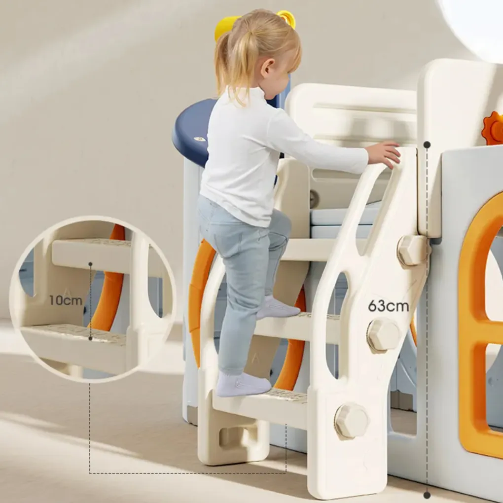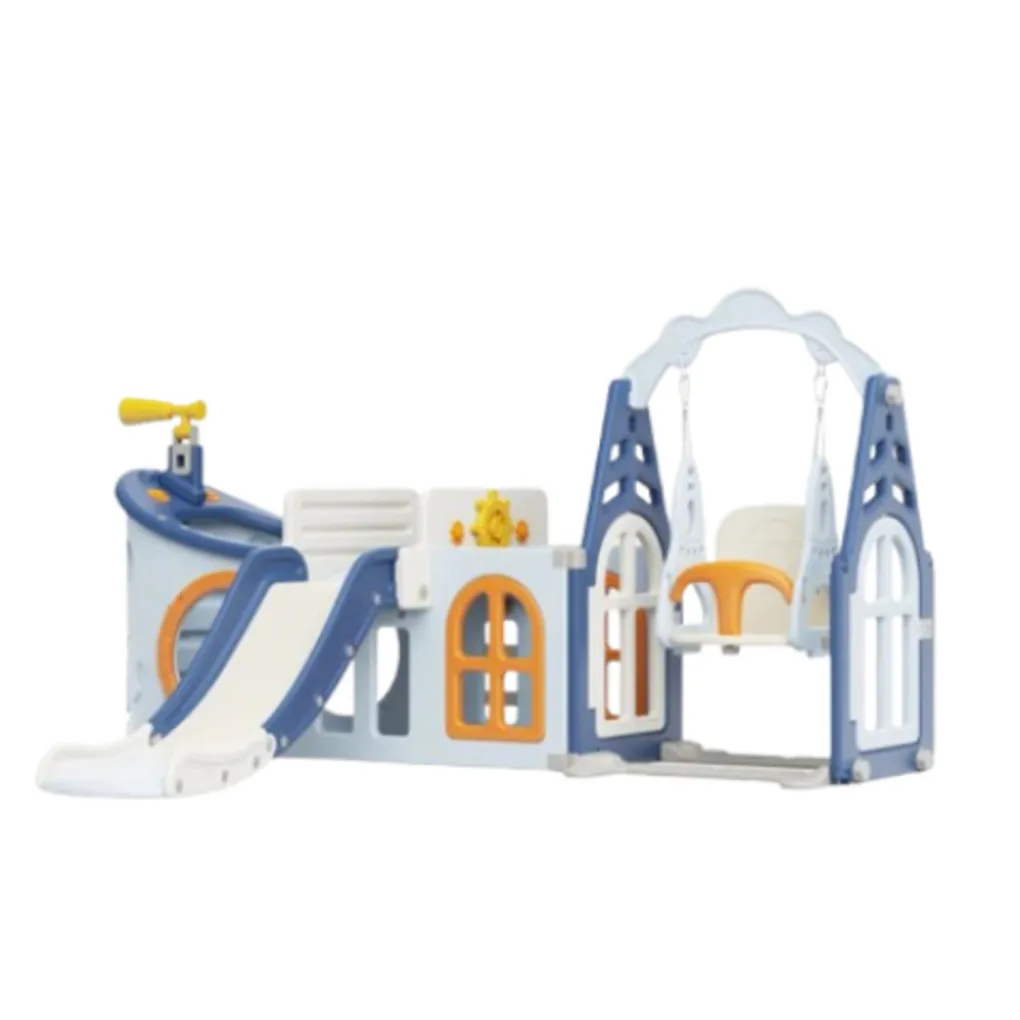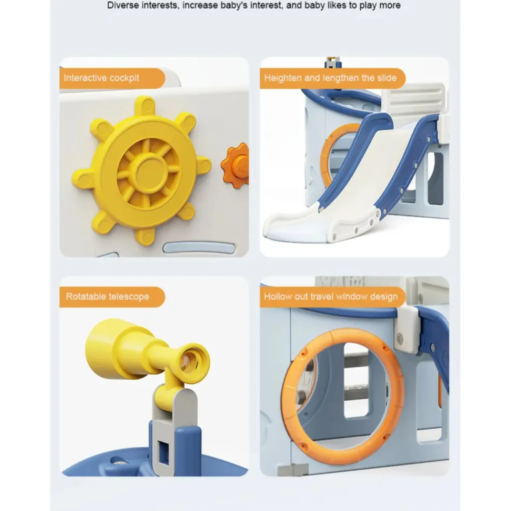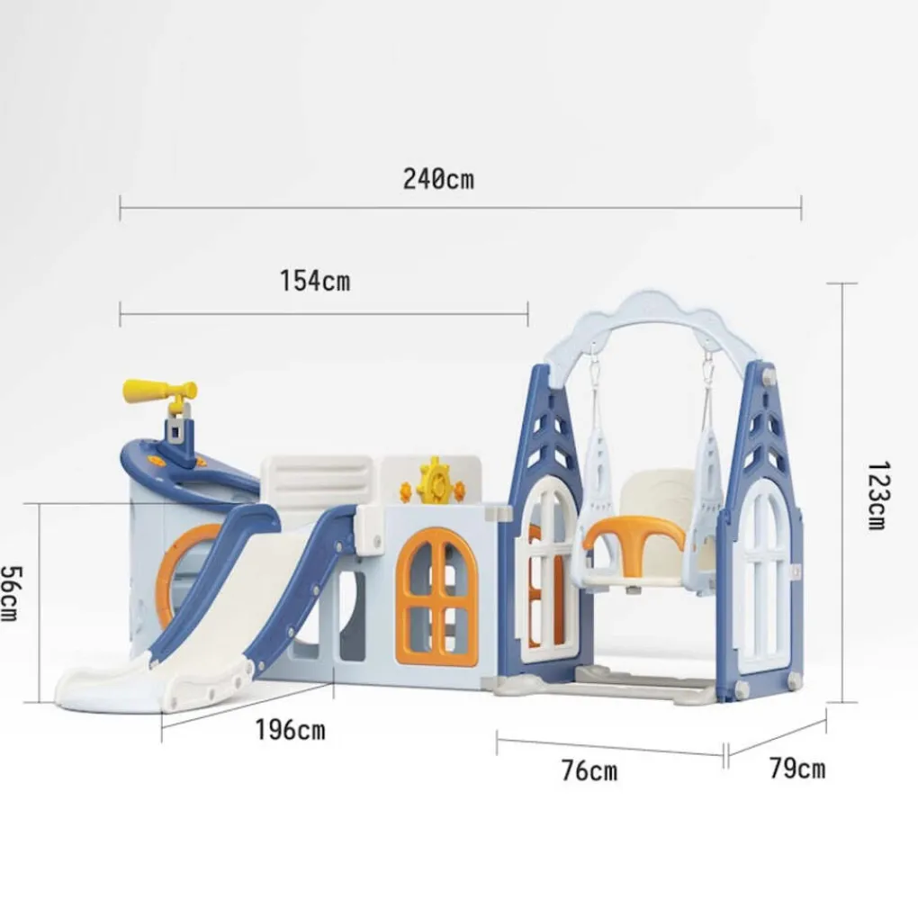 • Bevat een glijbaan, een schommel, een basketbalring (inclusief bal), een draaibare verrekijker en een roer