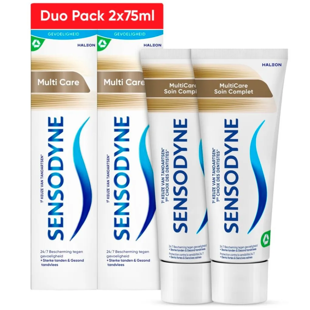 Twee keer per dag poetsen met Sensodyne MultiCare Tandpasta geeft klinisch bewezen verlichting bij gevoelige tanden. De tandpasta met fluoride versterkt je tandglazuur en helpt beschermen tegen cariës.