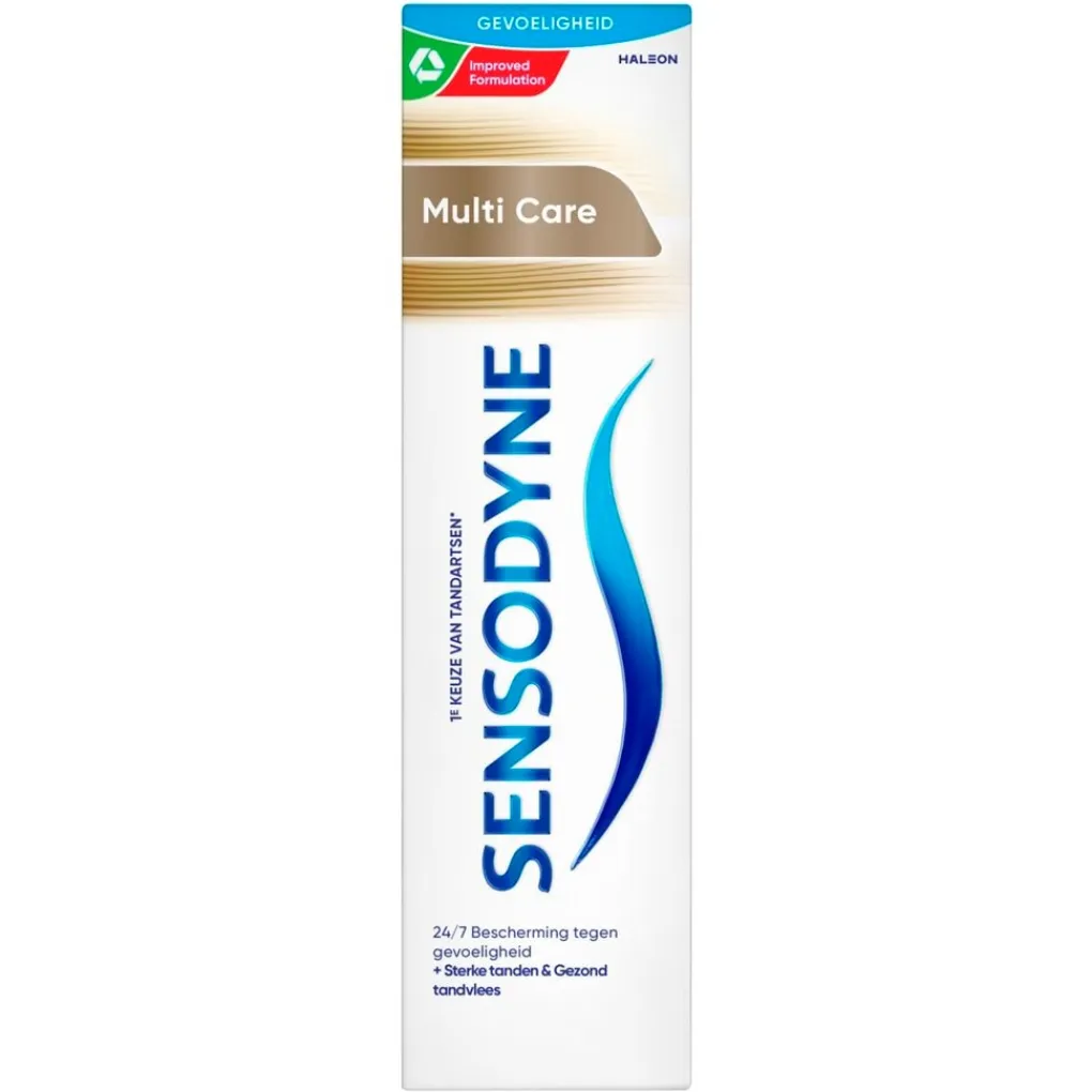 Twee keer per dag poetsen met Sensodyne MultiCare Tandpasta geeft klinisch bewezen verlichting bij gevoelige tanden. De tandpasta met fluoride versterkt je tandglazuur en helpt beschermen tegen cariës.