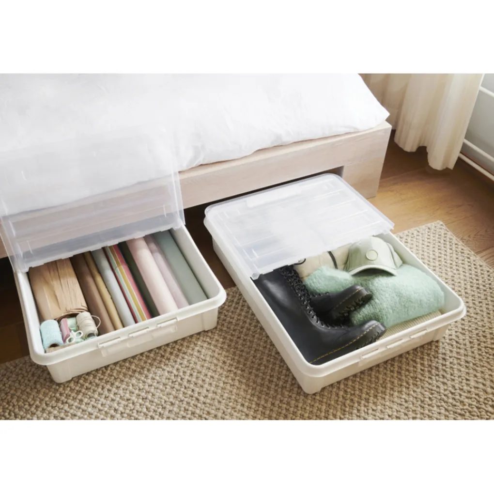 Transparante opbergdoos van 60L met wielen, ideaal voor onder het bed. Voorzien van een stevig deksel en stapelbaar. Perfect voor het organiseren van je ruimte en het beschermen van je spullen tegen stof en vuil.