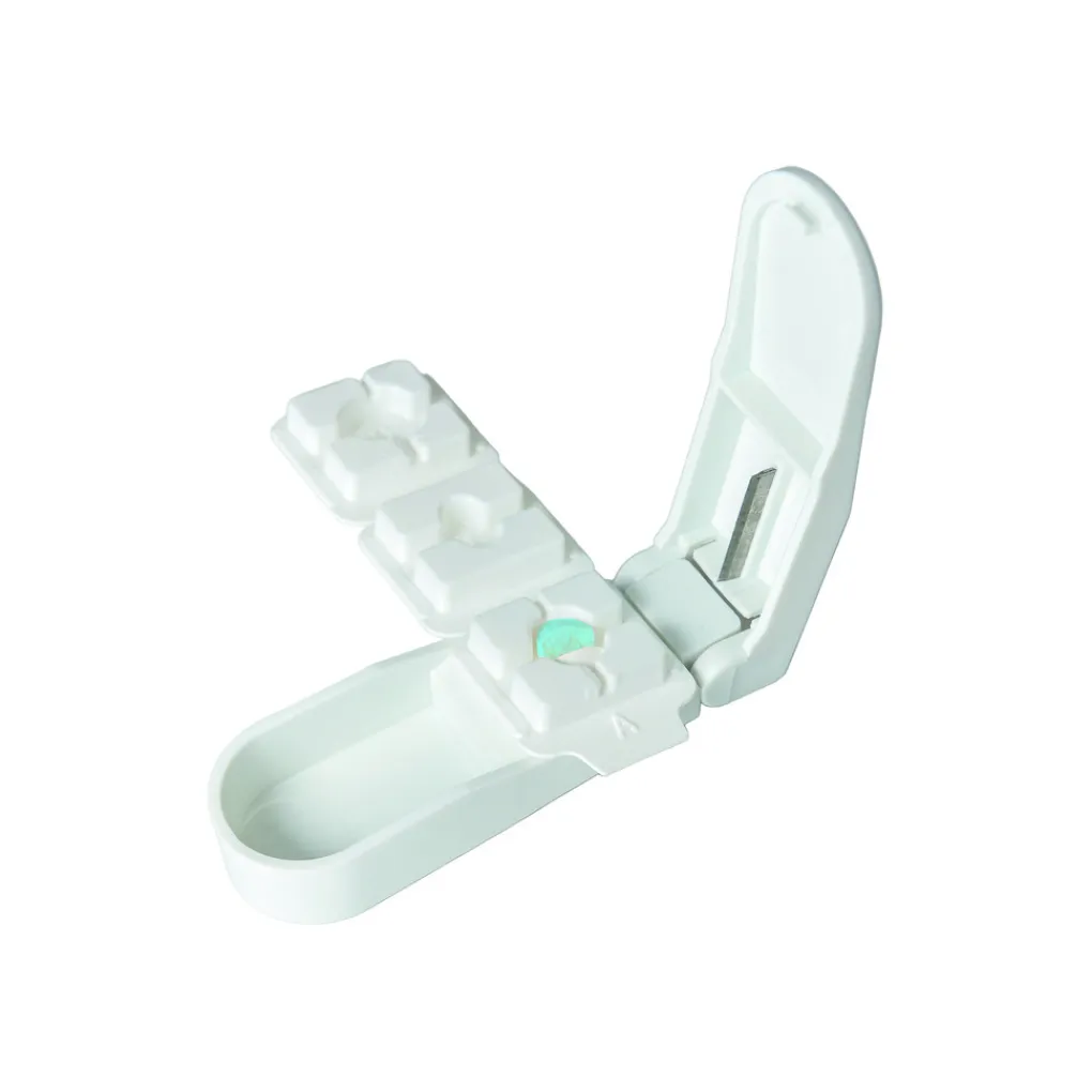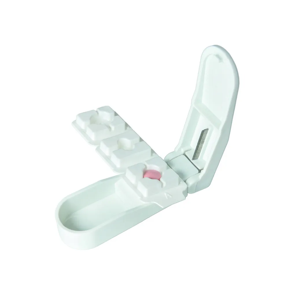De splijter is voorzien van een scherp roestvrijstalen snijmes dat zorgt voor een nauwkeurige snede zonder kruimelen of breken. Daarnaast beschikt het apparaat over een geïntegreerd opbergvak waarin gespleten tabletten netjes en veilig kunnen worden bewaard.