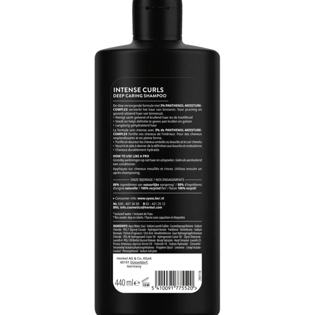 Syoss Intense Curls Deep Caring Shampoo reinigt golvend of krullend haar en reinigt je hoofdhuid. Hij voedt en helpt definitie te geven aan krullen en golven, voor langdurig gehydrateerd haar.