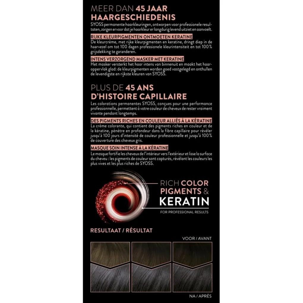 SYOSS permanente haarkleuringen, ontworpen voor professionele resultaten, zorgen ervoor dat je haarkleur er langdurig levend uitziet en aanvoelt. De kleurcrème, met rijke kleurpigmenten en keratine, dringt diep in de haarvezel om tot 100 dagen professionele kleurintensiteit en tot 100 % grijsdekking te garanderen. Het intens verzorgend masker met keratine versterkt het haar intens van binnenuit en maakt het haaroppervlak glad: de kleurpigmenten worden goed vastgelegd en onthullen de levendigste en rijkste kleuren van SYOSS.