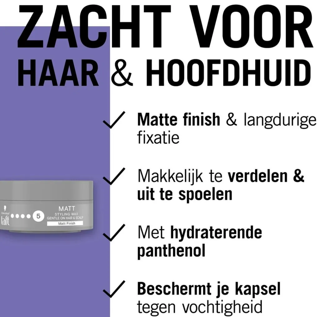 Je bent altijd in controle met de Taft Styling Matt Wax! Deze wax geeft een matte finish. Hij is zacht voor je haar en hoofdhuid en bevat hydraterende panthenol.