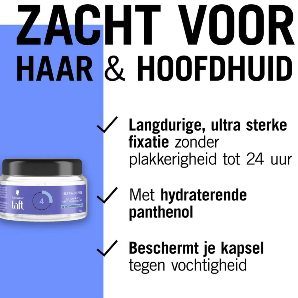 Je bent altijd in controle met de Taft Ultra Chaos Power Hold 4 Styling Gel! De stylinggel is speciaal voor het creëren van chaotische en warrige kapsels.