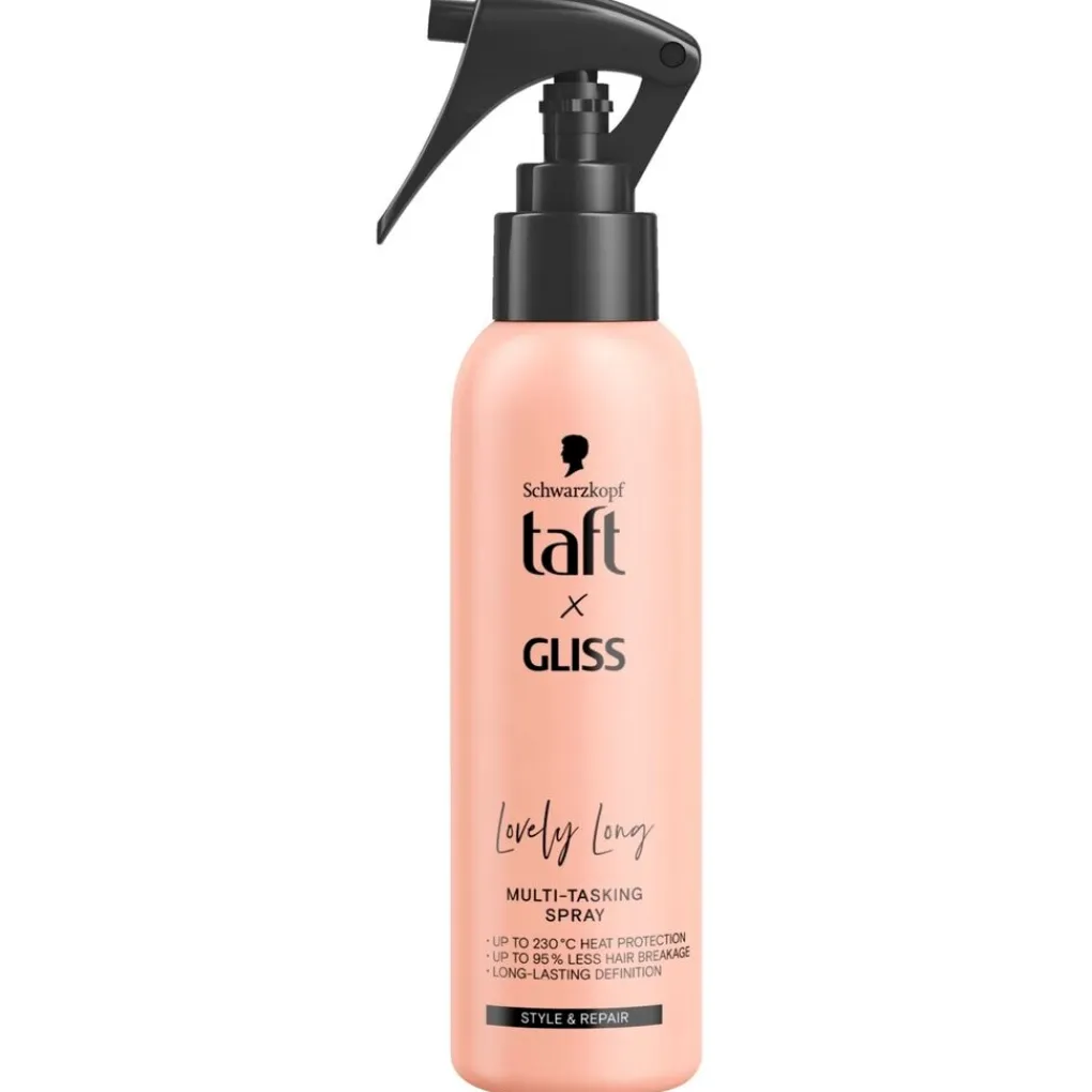 De Taft x Gliss Lovely Long Multitasking Spray combineert styling en verzorging. Hij biedt hittebescherming tot 230°C en zorgt voor tot 95% minder haarbreuk (versus onbehandeld haar).