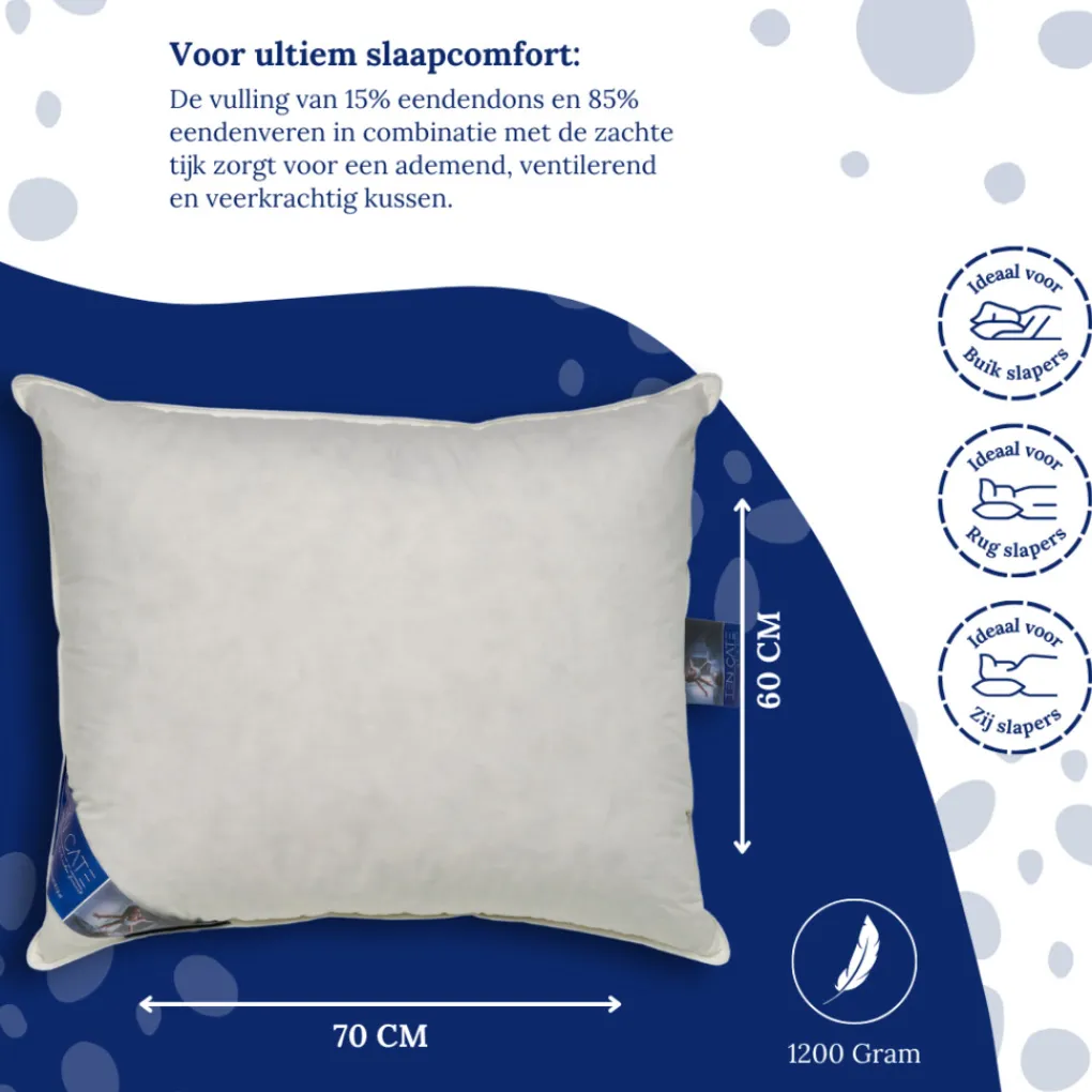 De vulling van 1200 gram biedt optimale ondersteuning: het eendendons voelt zacht aan, terwijl de eendenveren zorgen voor stevigheid.