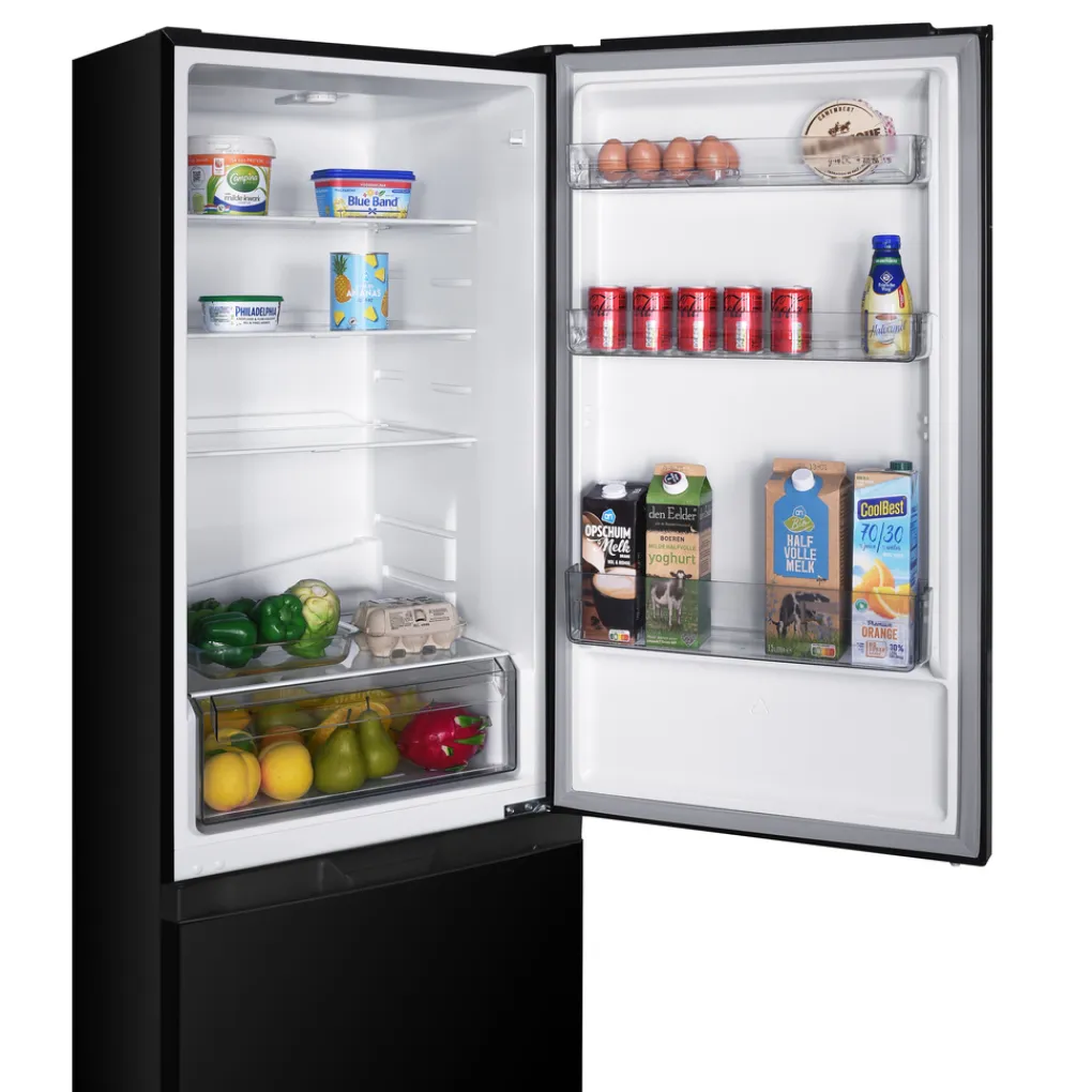 Deze koel-vriescombinatie heeft een compact en modern design. De industriële zwarte kleur van deze koel-vriescombinatie past bij elk interieur. Daarnaast heeft hij ook een strakke uitstraling dankzij de geïntegreerde handgreep.