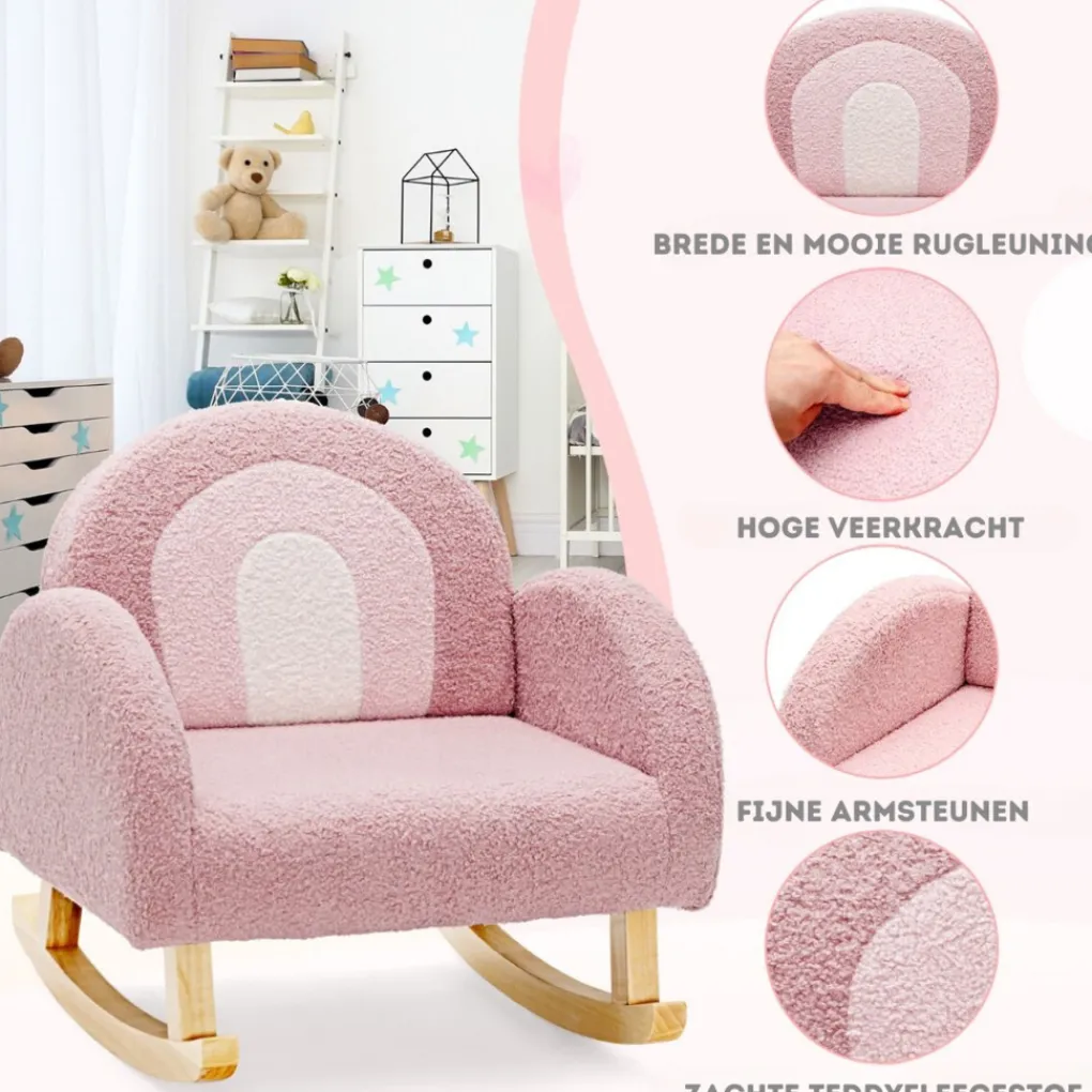 Geniet van heerlijk schommelen met deze zachte teddy stof schommelstoel in roze regenboog kleuren.