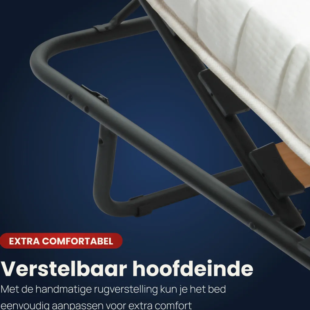 Stevig uitgevoerd vouwbed met handmatige rugverstelling voor optimale ondersteuning tijdens het slapen.