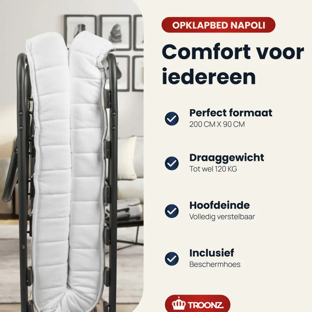 Ben je op zoek naar een comfortabel en handig vouwbed voor je logees of om zelf te gebruiken? Dan is het Troonz vouwbed Napoli handmatig verstelbaar 90×200 precies wat je nodig hebt! Dit luxe opklapbed is voorzien van een ergonomisch matras en een handige rugverstelling. Stevig, makkelijk op te bergen en inclusief gratis opberghoes. Investeer in een goede nachtrust met dit topproduct van Troonz!