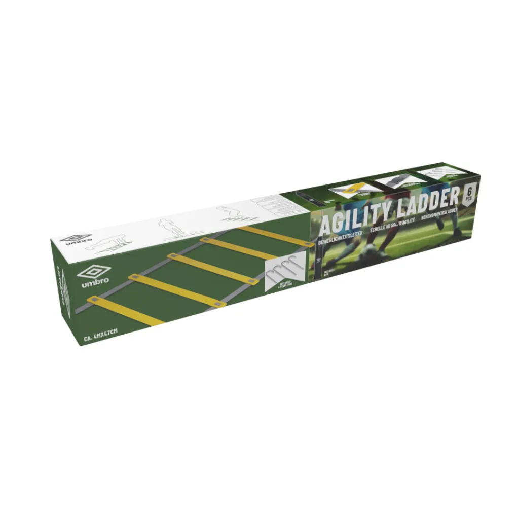 De Umbro loopladder is ideaal voetbaltrainingsmateriaal voor alle leeftijden. Je kunt de voetbal ladder zowel binnen als buiten gebruiken, ideaal wanneer het bijvoorbeeld slecht weer is en je toch iets aan beweging wil doen. Gebruik je de agility ladder buiten? Bevestig hem dan voor extra stevigheid in de grond met de 4 meegeleverde grondpinnen. Wanneer je de trainingsladder niet gebruikt, of met je mee wil nemen, rol je deze simpelweg op en plaats je hem in de opbergtas die ook meegeleverd wordt met de agility set.