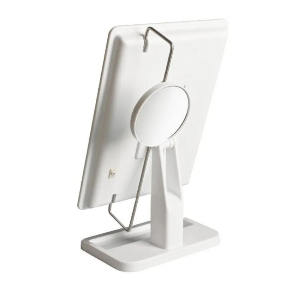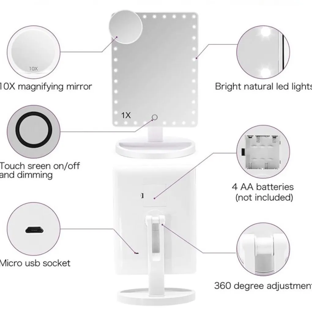 De spiegel is geïnspireerd op de populaire Hollywood Show spiegels en heeft een mooi, gezellig LED-lampje aan de rand dat je de perfecte verlichting geeft bij het aanbrengen van make-up. Op de spiegel is ook een kleinere ronde spiegel gemonteerd met een vergroting van 10 X, die in verschillende standen kan worden gezet.
