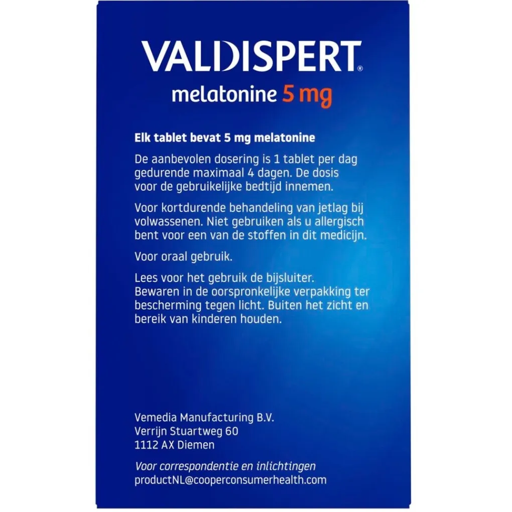 De Valdispert Melatonine 5mg Tabletten bevatten per tablet 5mg melatonine voor de kortdurende behandeling van een jetlag bij volwassenen.