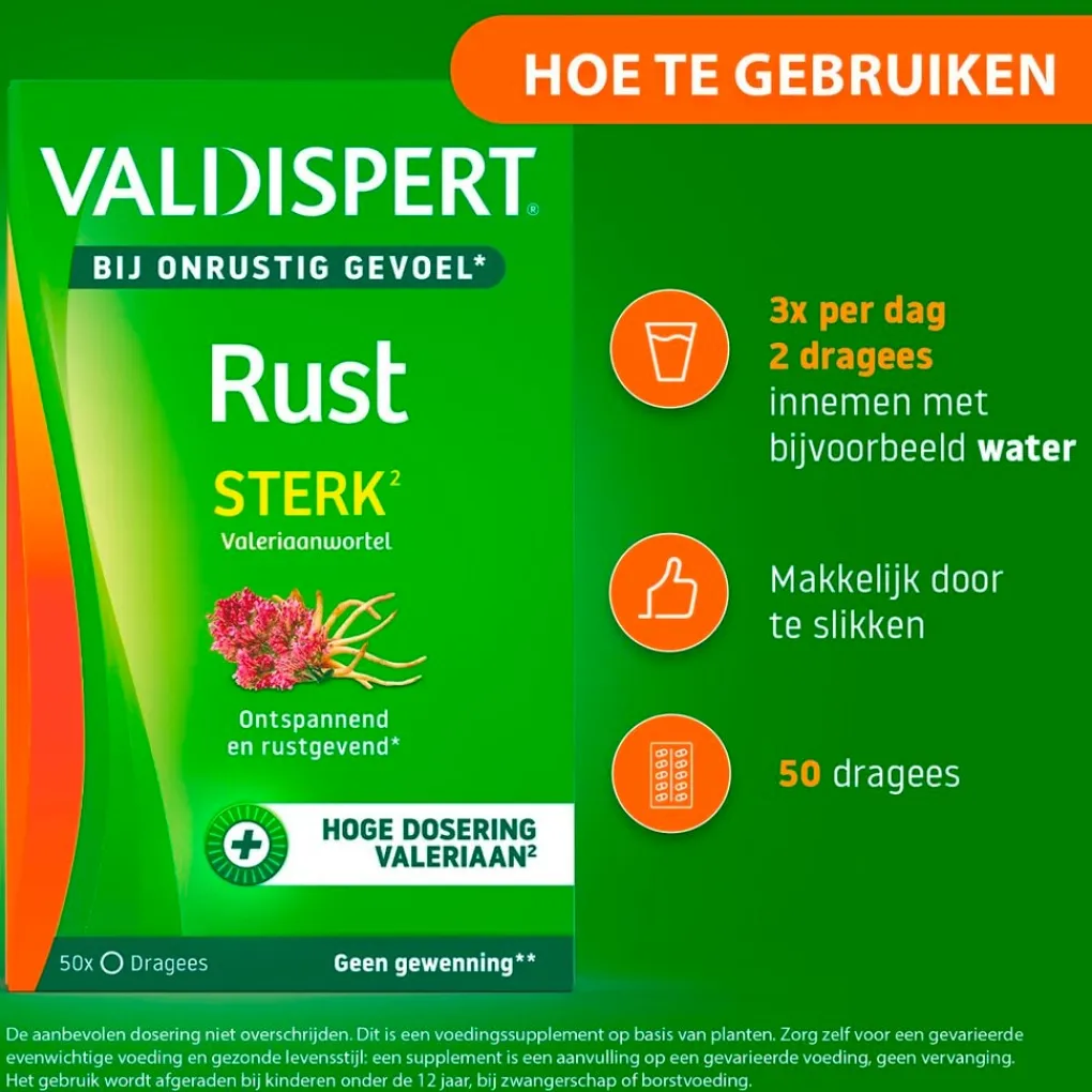Dosering: neem 3 keer per dag 2 dragees in. De aanbevolen dosering niet overschrijden. Slik de dragee in z’n geheel door, bijvoorbeeld met water. Valdispert Rust Sterk kan regelmatig en gedurende langere tijd gebruikt worden.