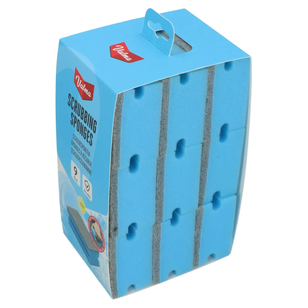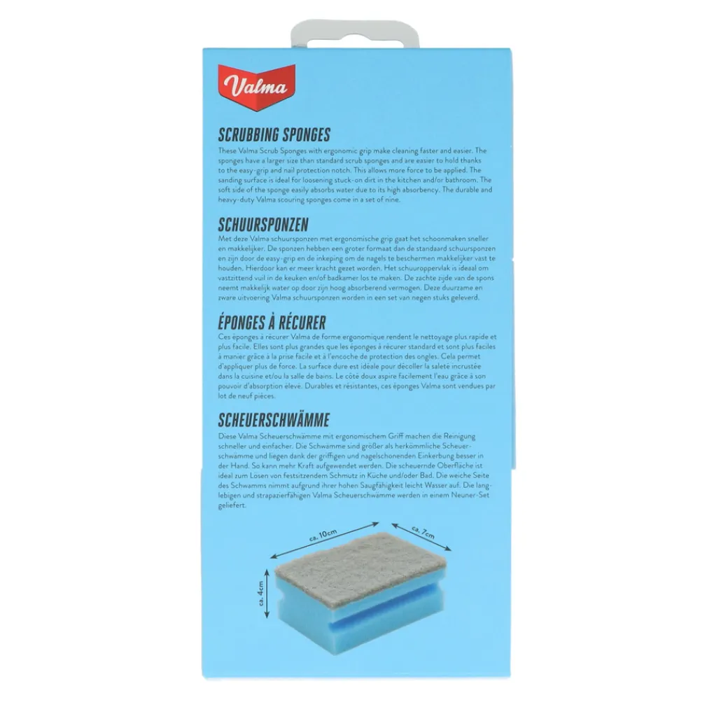 Met deze Valma schuursponzen met ergonomische grip gaat het schoonmaken sneller en makkelijker. De sponzen hebben een groter formaat dan de standaard schuursponzen en zijn door de easy-grip en nail protection inkeping makkelijker vast te houden. Hierdoor kan er meer kracht gezet worden. Het schuuroppervlak is ideaal om vastzittend vuil in de keuken en/of badkamer los te maken. De zachte zijde van de spons neemt makkelijk water op door zijn hoog absorberend vermogen. De duurzame en zware uitvoering Valma schuursponzen worden in een set van negen stuks geleverd.