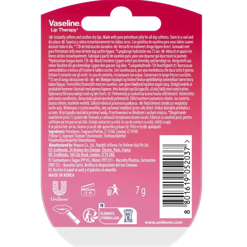 Vaseline Rosy Lip Therapy verzorgt en heelt droge of gescheurde lippen doordat hij je lippen helpt vocht vast te houden. De lipverzorging verzacht en kalmeert je lippen meteen en geeft ze een licht transparante roze kleur.