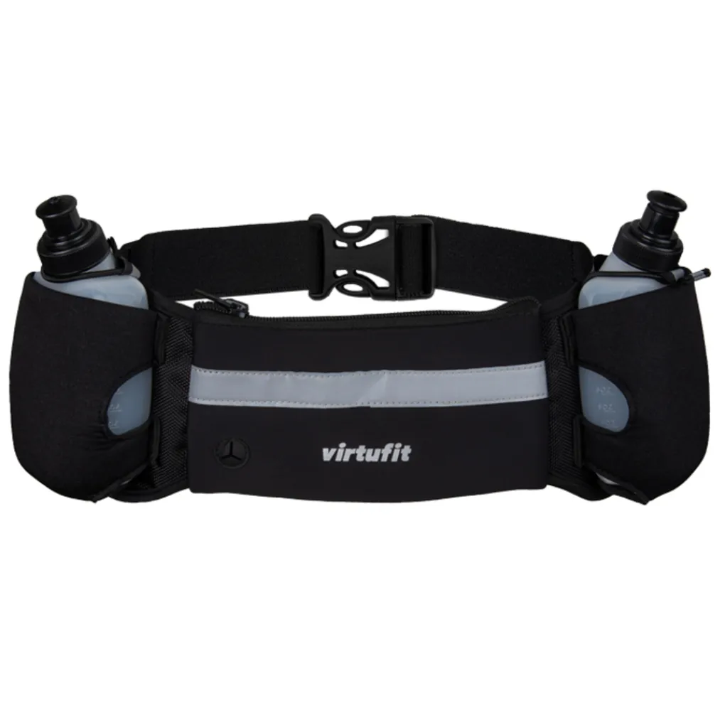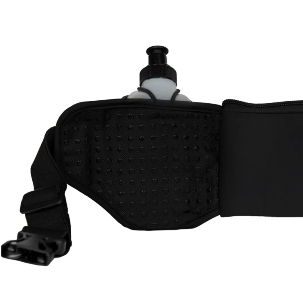 De riem heeft niet alleen twee drinkflessen, maar ook een opbergvak in het midden waar ruimte is voor je smartphone, huissleutel en/of ID-kaart. Luister je tijdens het hardlopen graag naar muziek of een podcast? In het opbergvak zit een opening waar je jouw oordopjes doorheen kunt halen.