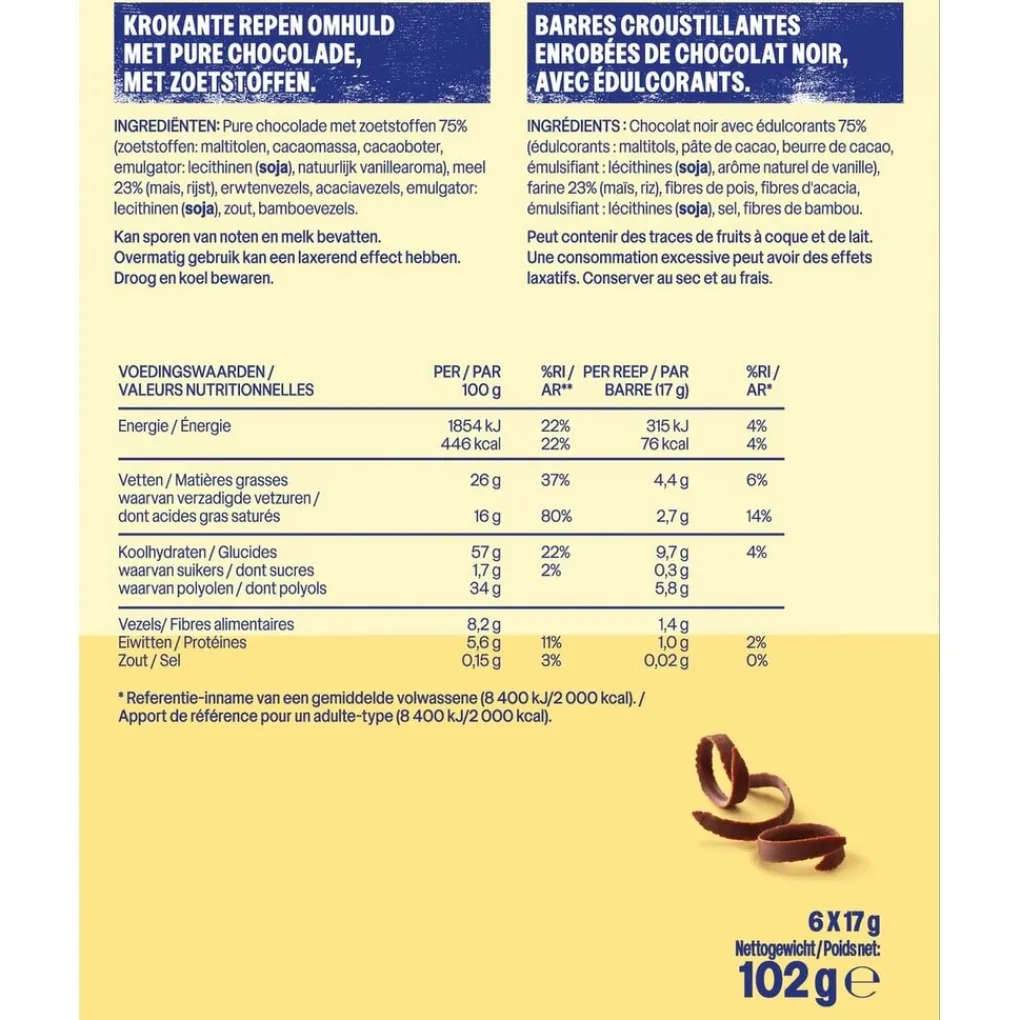 Krokante Repen Omhuld met Pure Chocolade, met Zoetstoffen.