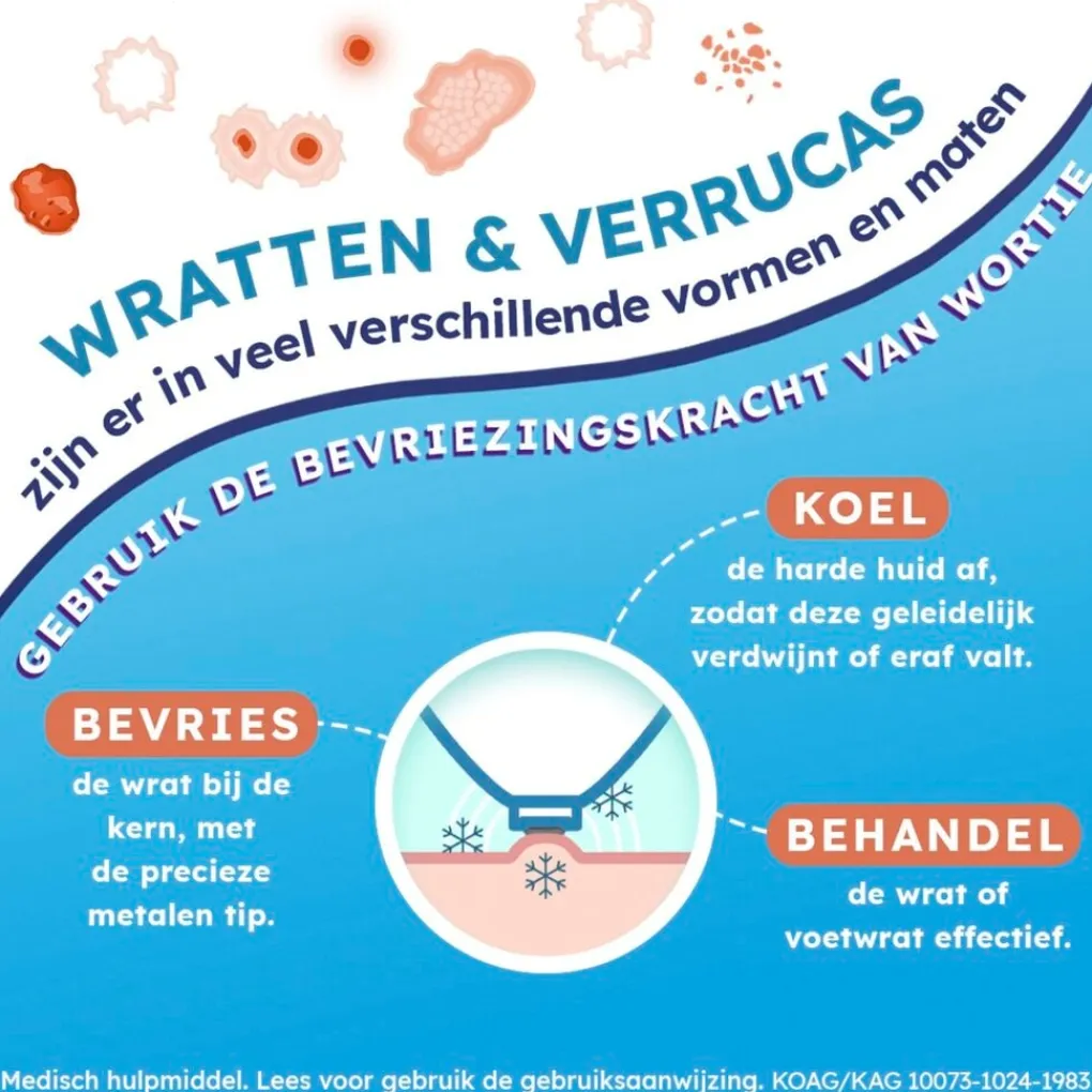 Wortie Freeze Wrattenverwijderaar bevriest de ongewenste (voet)wrat. Als de koude applicatortip op de wrat geplaatst wordt, bevriest de wrat binnen enkele seconden en wordt de wrat wit. De bevroren huid van de wrat zal na ongeveer 10 tot 14 dagen van de huid loslaten. In de tussentijd heeft zich daaronder nieuwe huid gevormd.